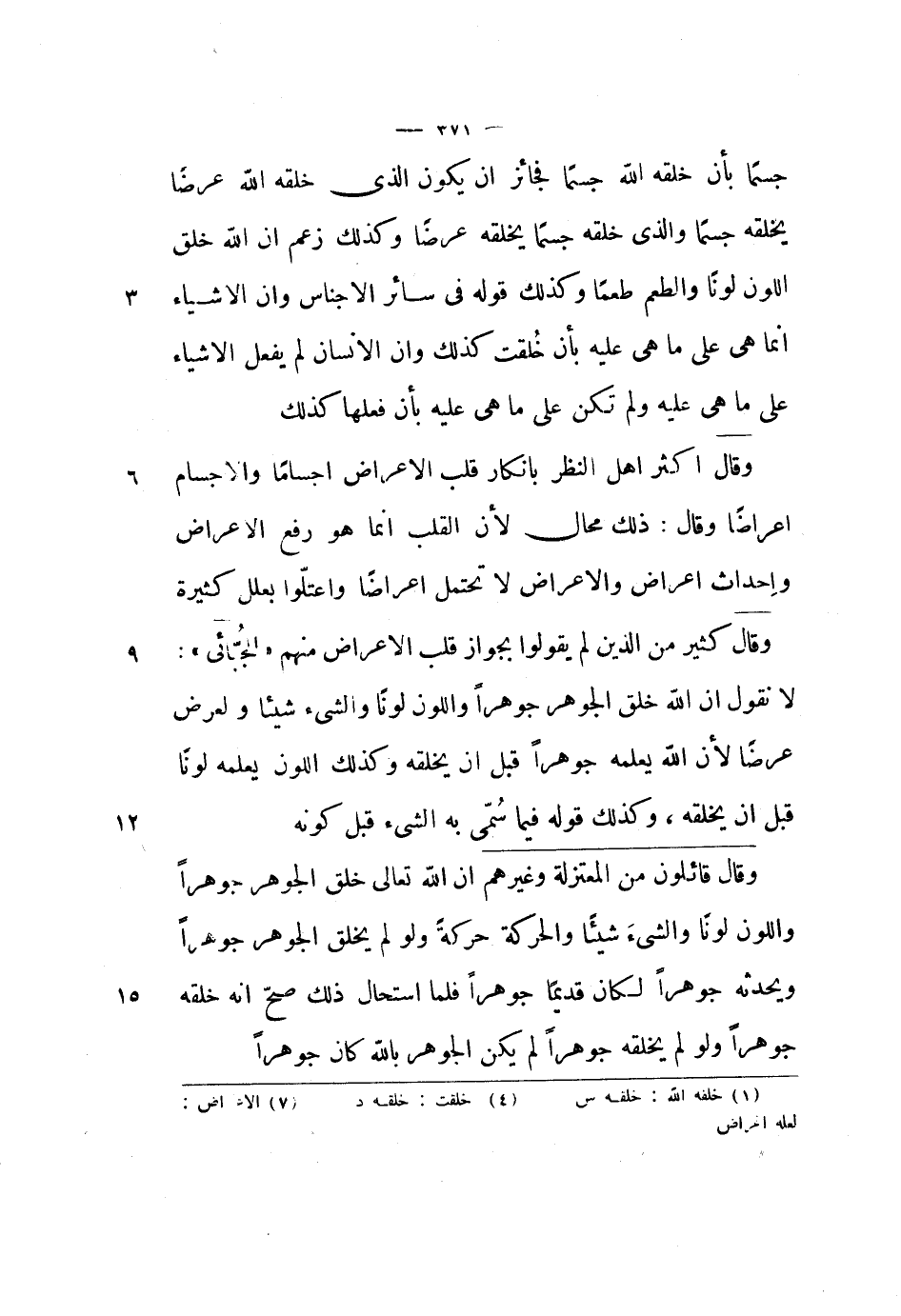 جسماً بأن خلقه الله جسماً فجائز أن يكون الذي خلقه الله عرضاً يخلقه جسماً والذي خلقه جسماً يخلقه عرضاً وكذلك زعم أن الله خلق اللون لوناً والطعم طعماً وكذلك قوله في سائر الأجناس وأن الأشياء إنما هي على ما هي عليه بأن خلقت كذلك وأن الإنسان لم يفعل الأشياء على ما هي عليه ولم تكن على ما هي عليه بأن فعلها كذلك.
