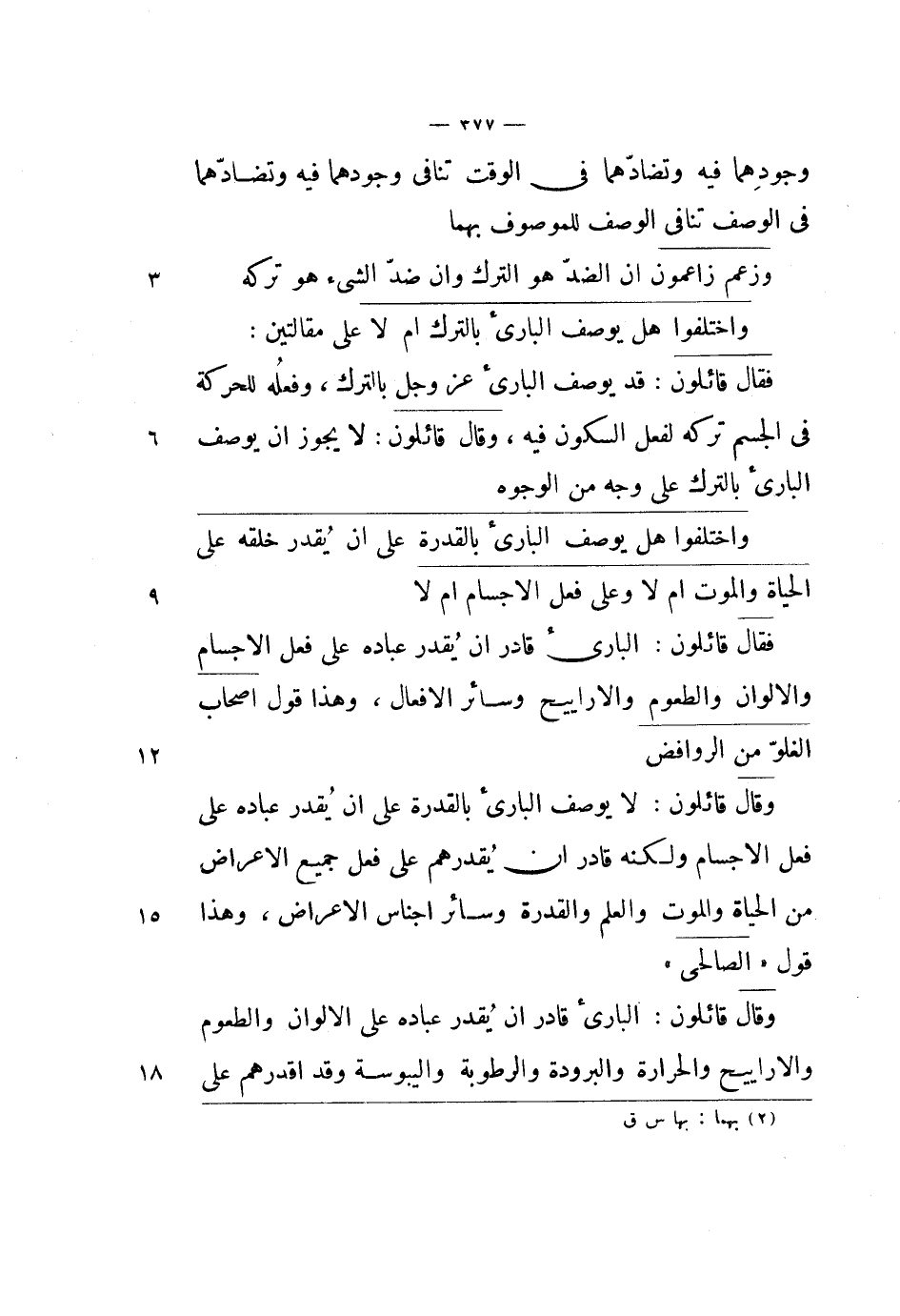 وقال قائلون: البارئ قادر أن يقدر عباده على الألوان والطعوم والأراييح والحرارة والبرودة