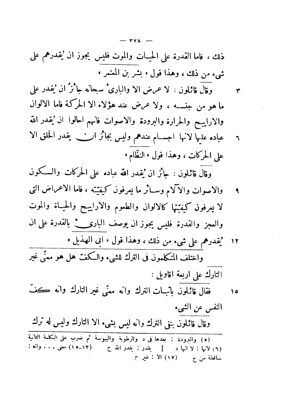 واختلف المتكلمون في الترك للشيء والكف هل هو معنى غير التارك على أربعة أقاويل: