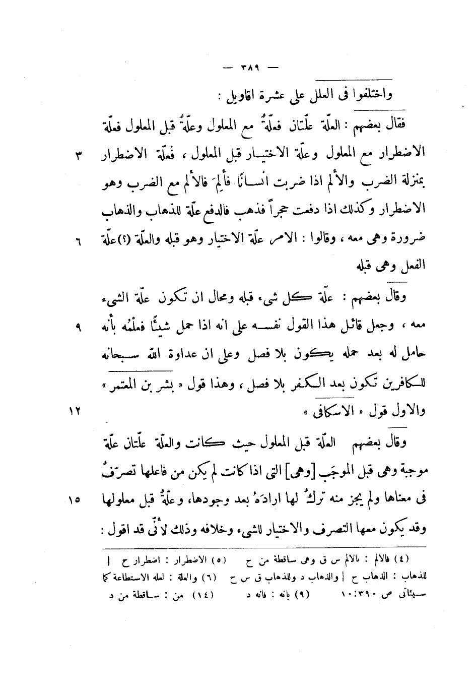 وقال بعضهم: علة كل شيء قبله ومحال أن تكون علة الشيء معه، وجعل قائل هذا القول نفسه على أنه إذا حمل شيئاً فعلمه بأنه حامل له بعد حمله يكون بلا فصل وعلى أن عداوة الله سبحانه للكافرين تكون بعد الكفر بلا فصل، وهذا قول بشر بن المعتمر والأول قول الإسكافي.