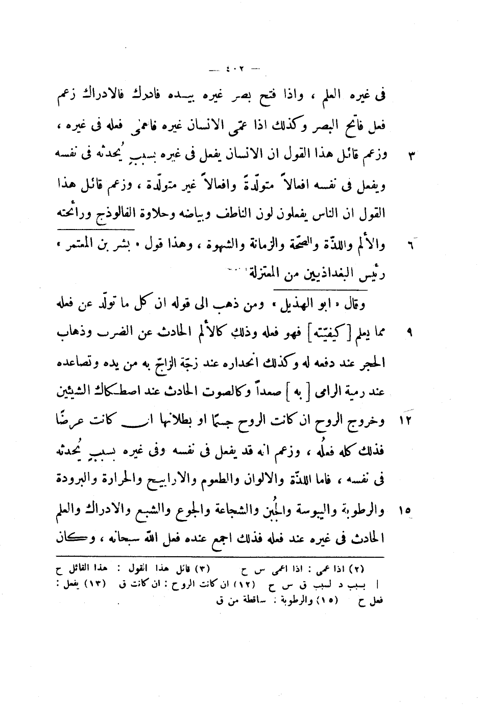 وقال أبو الهذيل ومن ذهب إلى قوله أن كل ما تولد عن فعله مما يعلم كيفيته فهو فعله وذلك كالألم الحادث عن الضرب وذهاب الحجر عند دفعه له وكذلك انحداره عند زجة الزاج به من يده وتصاعده عند رمية الرامي به صعداً وكالصوت الحادث عند اصطكاك الشيئين وخروج الروح إن كانت الروح جسماً أو بطلانها إن كانت عرضاً فذلك كله فعله، وزعم أنه قد يفعل في نفسه وفي غيره بسبب يحدثه في نفسه، فأما اللذة والألوان والطعوم والأراييح والحرارة والبرودة والرطوبة واليبوسة والجبن والشجاعة والجوع والشبع والإدراك والعلم الحادث في غيره عند فعله فذلك أجمع عنده فعل الله سبحانه، وكان
