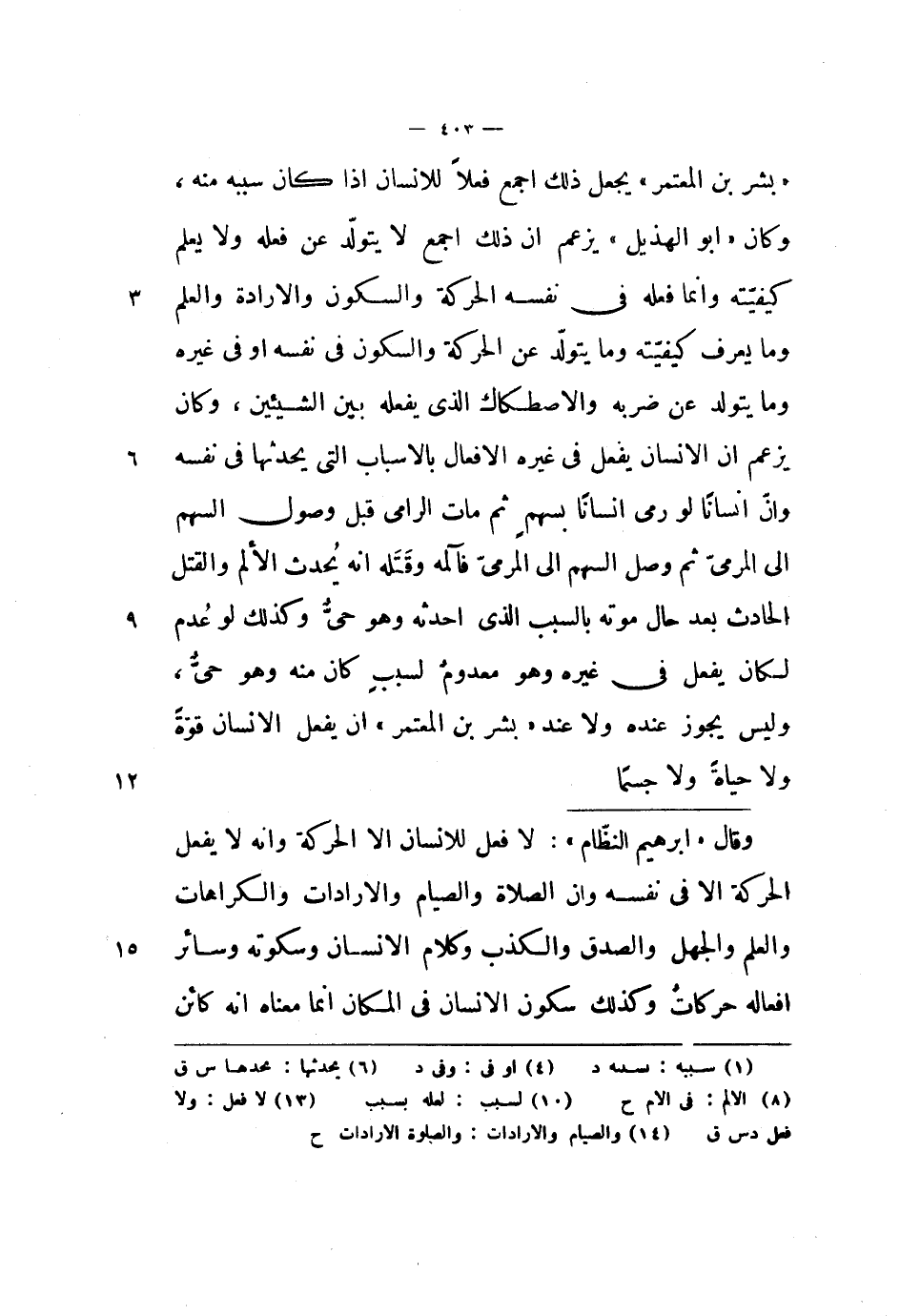 بشر بن المعتمر يجعل ذلك أجمع فعلاً للإنسان إذا كان سببه منه، وكان أبو الهذيل يزعم أن ذلك أجمع لا يتولد عن فعله ولا يعلم كيفيته وإنما فعله في نفسه الحركة والسكون والإرادة والعلم وما يعرف كيفيته وما يتولد عن الحركة والسكون في نفسه أو في غيره وما يتولد عن ضربه والاصطكاك الذي يفعله بين الشيئين، وكان يزعم أن الإنسان يفعل في غيره الأفعال بالأسباب التي يحدثها في نفسه وأن إنساناً لو رمى إنساناً بسهم ثم مات الرامي قبل وصول السهم إلى المرمي ثم وصل السهم إلى المرمي فآلمه وقتله أنه يحدث الألم والقتل الحادث بعد حال موته بالسبب الذي أحدثه وهو حي وكذلك لو عدم لكان يفعل في غيره وهو معدوم لسبب كان منه وهو حي، وليس يجوز عنده ولا عند بشر بن المعتمر أن يفعل الإنسان قوة ولا حياة ولا جسماً.