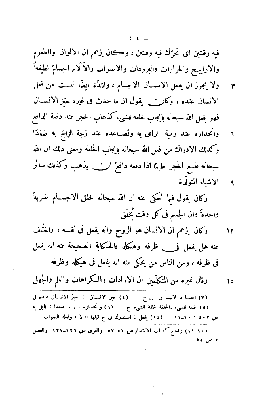 وكان يزعم أن الإنسان هو الروح وأنه يفعل في نفسه، واختلف عنه هل يفعل في ظرفه وهيكله فالحكاية الصحيحة عنه أنه يفعل في ظرفه، ومن الناس من يحكي عنه أنه يفعل في هيكله وظرفه.