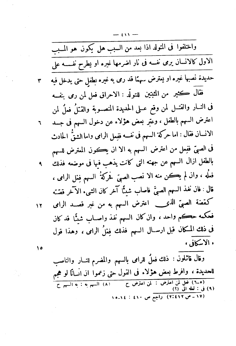 فقال كثير من المثبتين للتولد: الإحراق فعل لمن رمى بنفسه في النار والقتل لمن وقع على الحديدة المنصوبة والقتل فعل لمن اعترض السهم بالطفل، وعبر بعض هؤلاء عن دخول السهم في جسدالإنسان فقال: أنا حركة السهم في نفسه ففعل الرامي وأم الشق الحادث في الصبي ففعل من اعترض السهم به إلا أن يكون المعترض للسهم بالطفل أزال السهم عن جهته التي كانت يهذب فيها موضعه فذلك فعله، وإن لم يكن منه إلا نصب الصبي فحركة السهم فعل الرامي، قال: فإن نفذ السهم الصبي فأصاب شيئاً آخر كان الشيء الآخر قصته كقصة الصبي الذي اعترض السهم به من غير قصد الرامي فحكمه حكم واحد، وإن كان السهم نفذ وأصاب شيئاً قد كان في ذلك المكان قبل إرسال السهم فذلك فعل الرامي، وهذا قول الإسكافي.