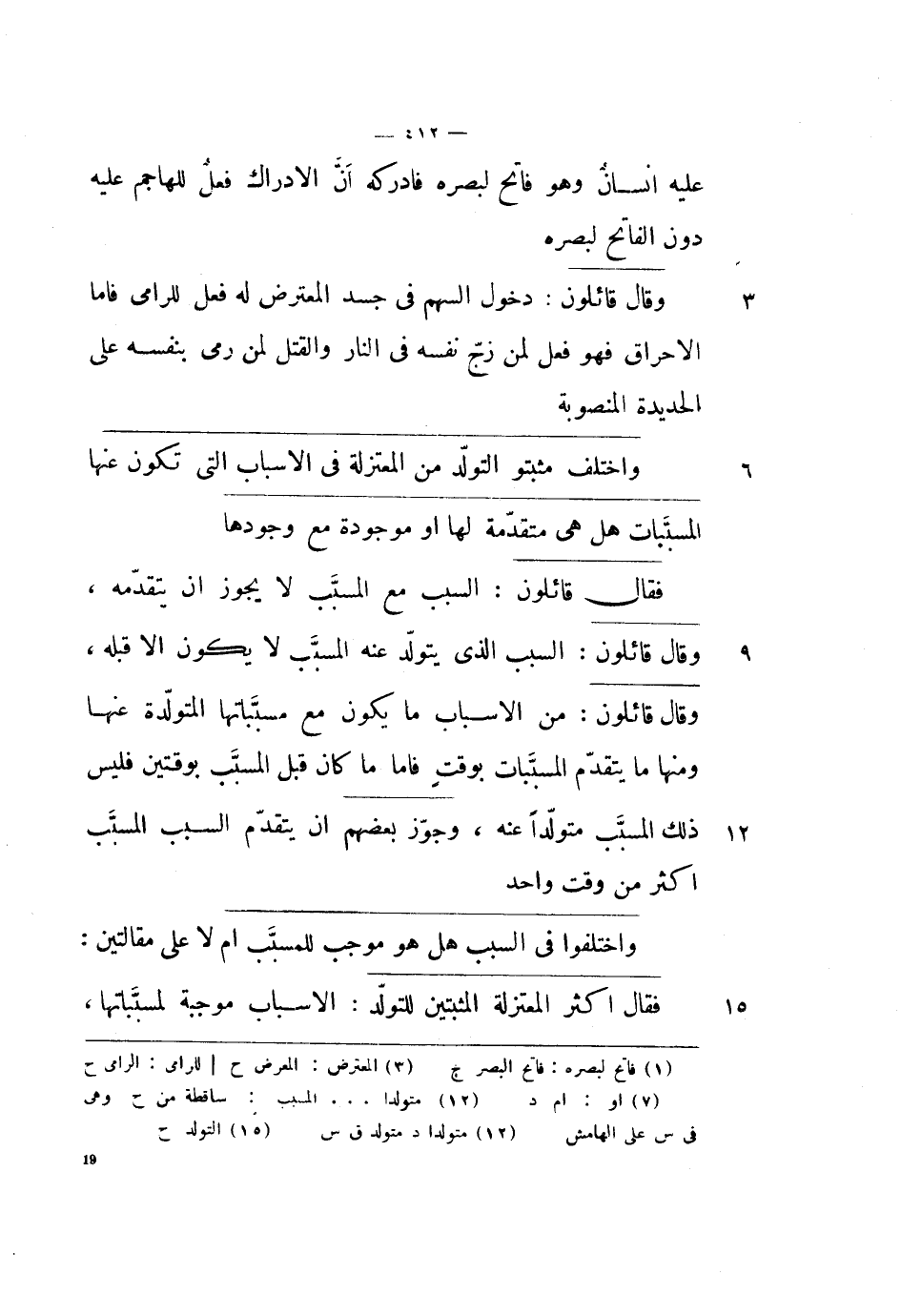 واختلف مثبتو التولد من المعتزلة في الأسباب التي تكون عنها المسببات هل هي متقدمة لها أو موجودة مع وجودها: