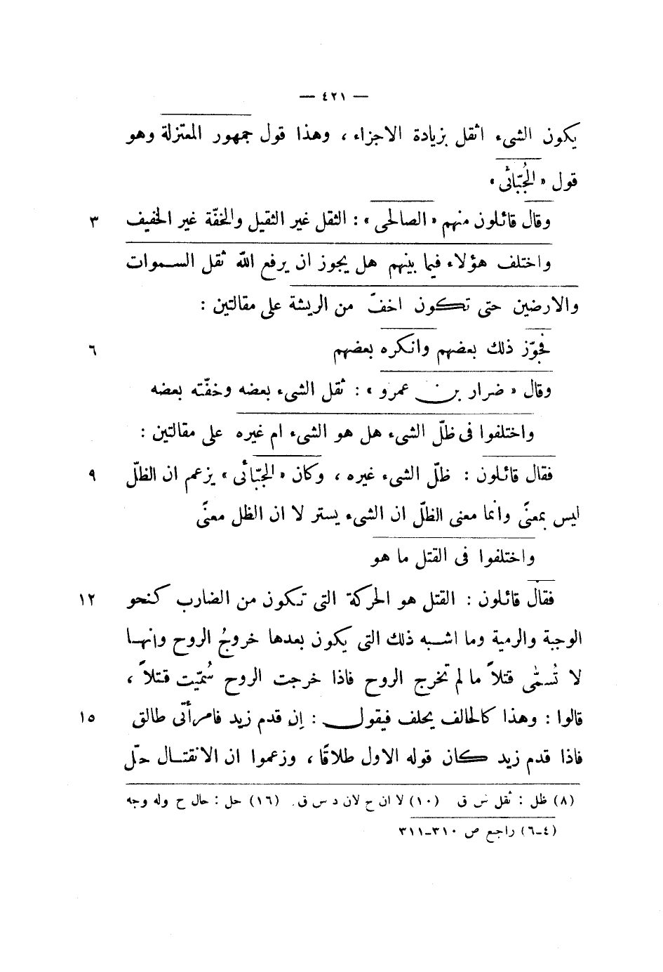 فقال قائلون: ظل الشيء غيره، وكان الجبائي يزعم أن الظل ليس بمعنى وإنما معنى الظل أن الشيء يستر لا أن الظل معنى.