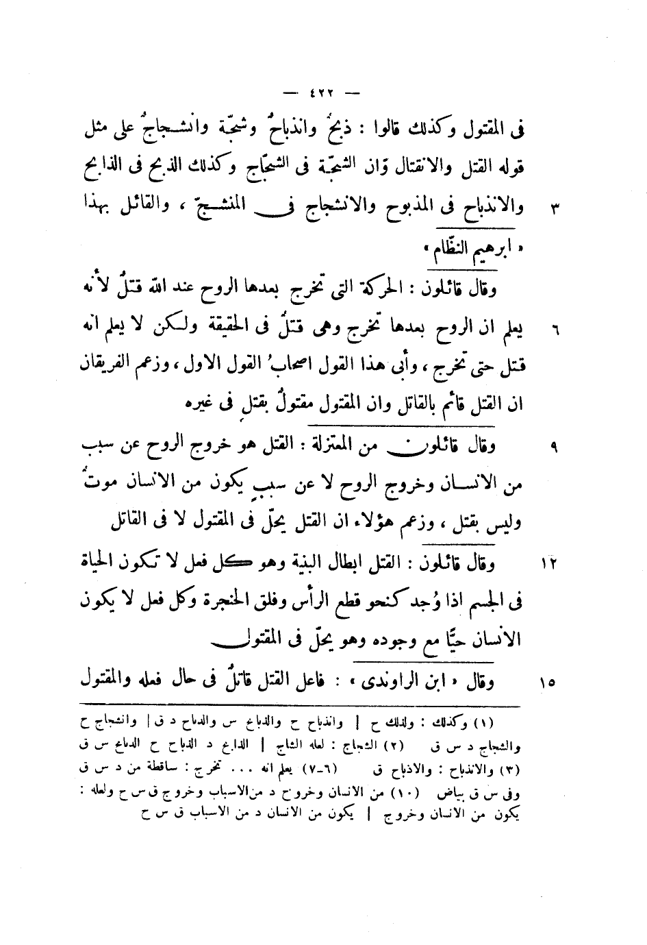 في المقتول وكذلك قاولا: ذبح وانذباح وشجة وانشجاج على مثل قوله القتل والانقتال وأن الشجة في الشجاج وكذلك الذبح في الذابح والانذباح في المذبوح والانشجاج في المنشج، والقائل بهذا إبراهيم النظام.
