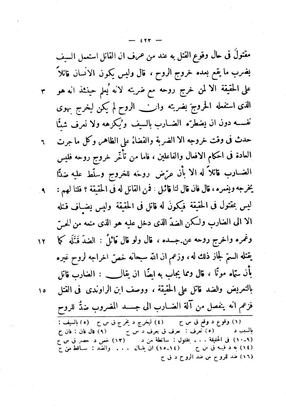 مقتول في حال وقوع القتل به عند من عرف أن القاتل استعمل السيف بضرب ما يقع بعده خروج الروح، قال: وليس يكون الإنسان قاتلاً على الحقيقة إلا لمن خرج روحه مع ضربته لأنه يعلم حينئذ أنه هو الذي استفعله الخروج بضربته وأن الروح لم يكن ليخرج بهوى نفسه دون أن يضطره الضارب بالسيف ويكرهه ولا نعرف شيئاً حدث في وقت خروجه إلا الضربة والقضاء على الظاهر وكل ما جرت العادة في إحكام الأفعال والفاعلين، فأما من تأخر خروج روحه فليس الضارب قاتلاً له إلا بأن عرض روحه للخروج وسلط عليه ضداً يخرجه ويغمره، قال: فإن قال لنا قائل: فمن القاتل له في الحقيقة؟ قلنا لهم: ليس بمقتول في الحقيقة فيكون له قاتل في الحقيقة وليس يضاف قتله إلا إلى الضارب ولكن الضد الذي دخل عليه هو الذي منعه من الحس وغمره وأخرج روحه عن جسده، قال: ولو قال قائل: الضد قتله كما يقتله السم لجاز ذلك له، وزعم أن الله سبحانه خص إخراجه لروح غيره بأن سماه موتاً، قال: ومما يجاب به أيضاً أن يقال: الضارب قاتل بالتعريض والضد قاتل على الحقيقة، ووصف ابن الراوندي في القتل فزعم