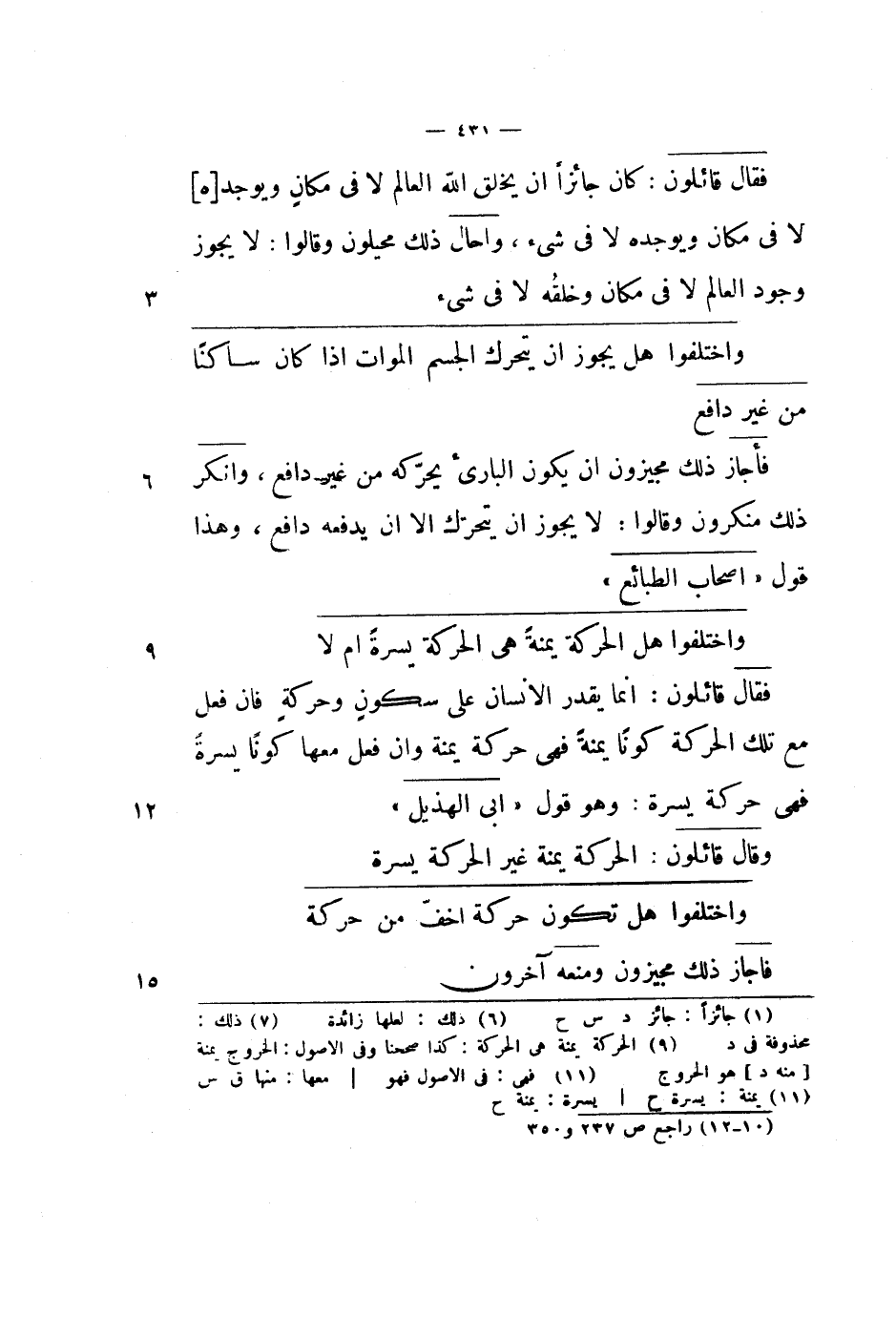 فقال قائلون: كان جائزاً أن يخلق الله العالم لا في مكان ويوجده لا في مكان ويوجده لا في شيء، وأحال ذلك محيلون وقالوا: لا يجوز وجود العالم لا في مكان وخلقه لا في شيء.