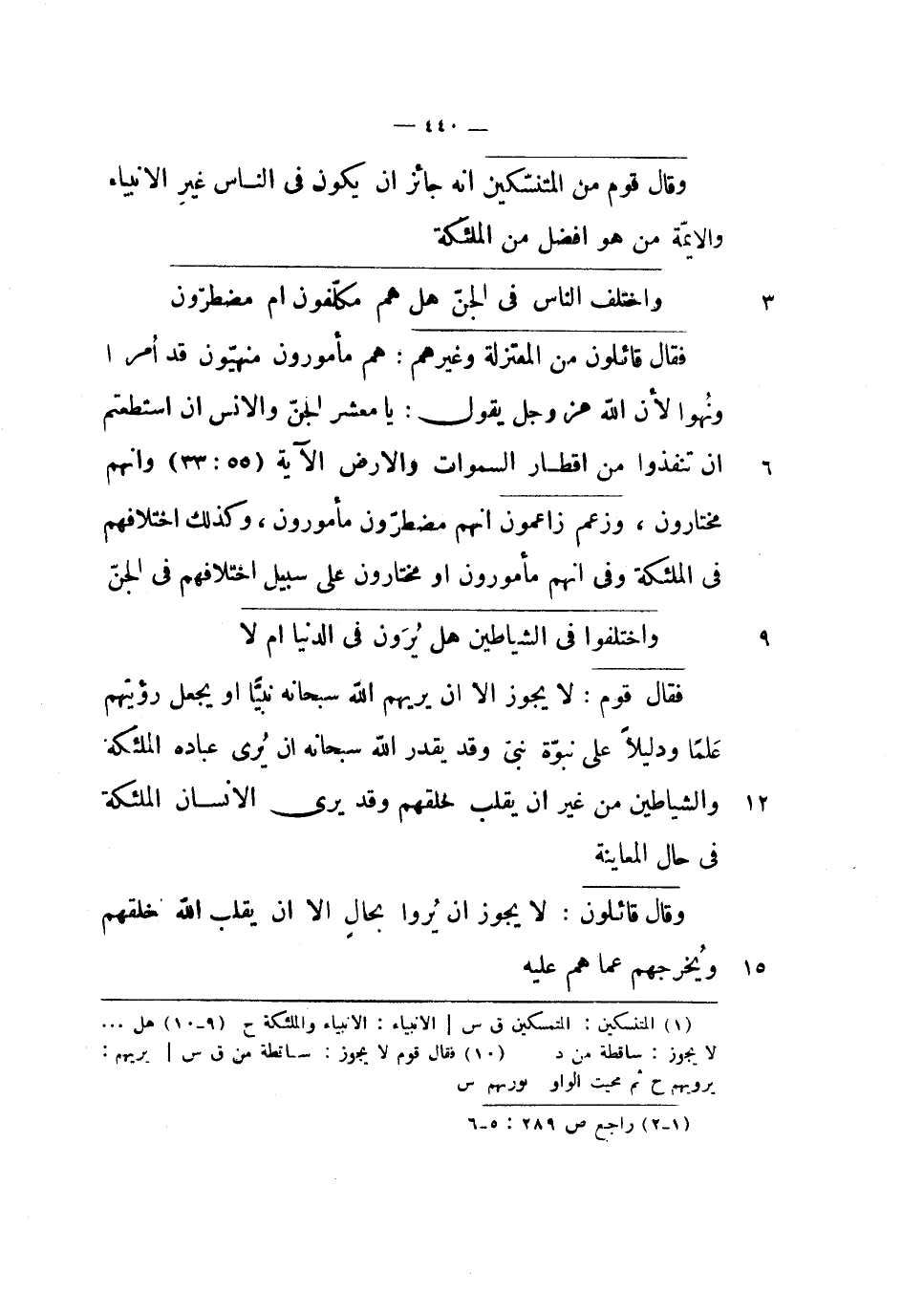 فقال قائلون من المعتزلة وغيرهم: هم مأمورون منهيون قد أمروا ونهوا لأن الله عز وجل يقول: يا معشر الجن والإنس إن استطعتم أن تنفذوا من أقطار السموات والأرض وأنهم مختارون، وزعم زاعمون أنهم مضطرون مأمورون، وكذلك اختلافهم في الملائكة وفي أنهم مأمورون أو مختارون على سبيل اختلافهم في الجن.