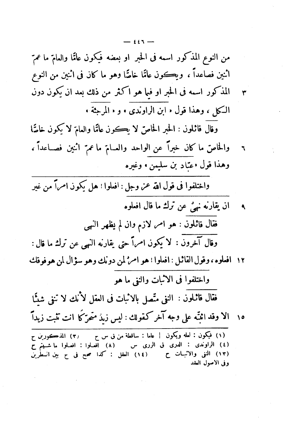 من النوع المذكور اسمه في الخبر أو بعضه فيكون عاماً والعام ما عم اثنين فصاعداً، ويكون عاماً خاصاً وهو ما كان في اثنين من النوع المذكور اسمه في الخبر أو فيما هو أكثر من ذلك بعد أن يكون دون الكل، وهذا قول ابن الراوندي والمرجئة.