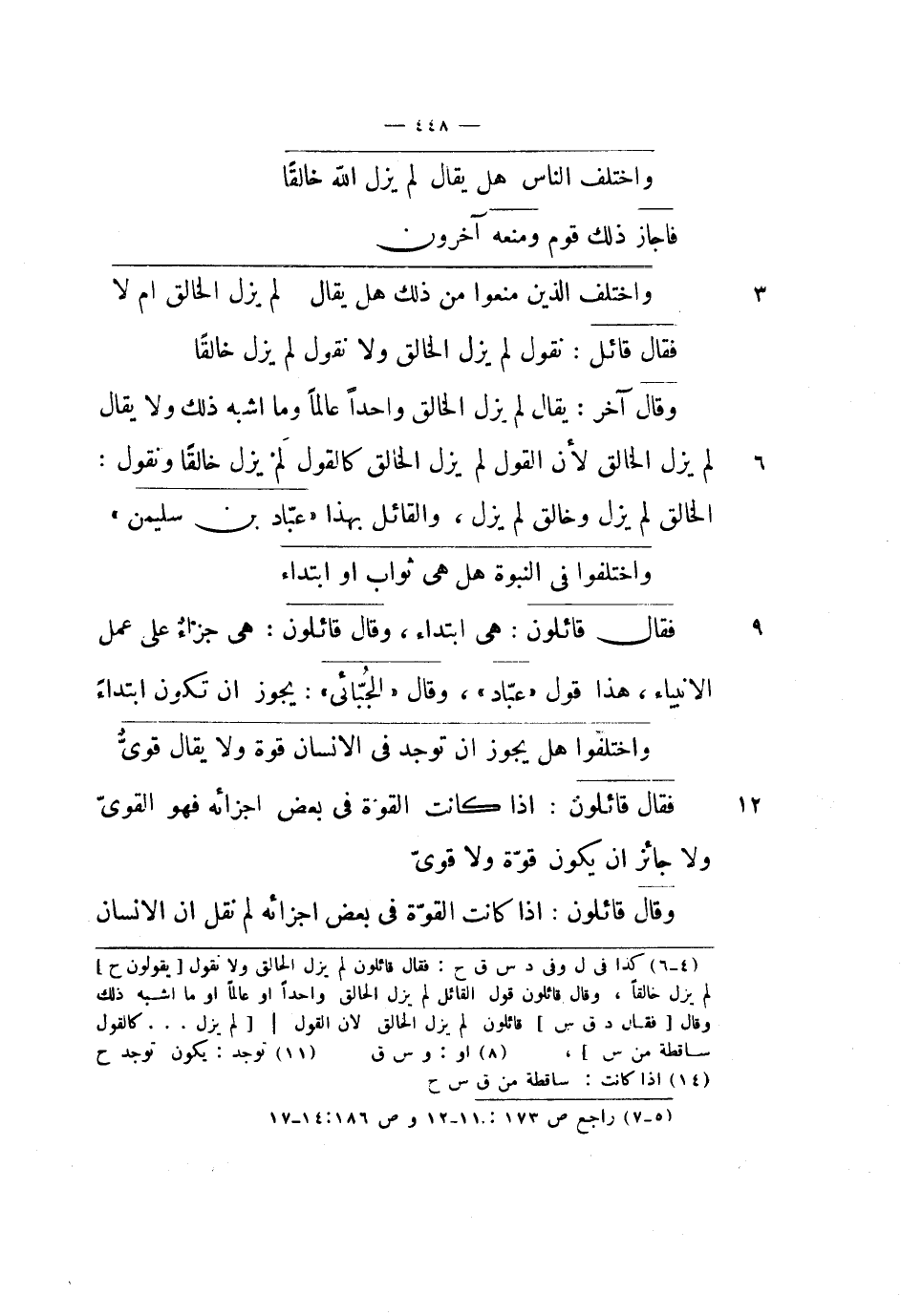 وقال آخر: يقال لم يزل الخالق واحداً عالماً وما أشبه ذلك ولا يقال لم يزل الخالق لأن القول لم يزل الخالق كالقول لم يزل خالقاً ونقول: الخالق لم يزل وخالق لم يزل، والقائل بهذا عباد بن سليمان.