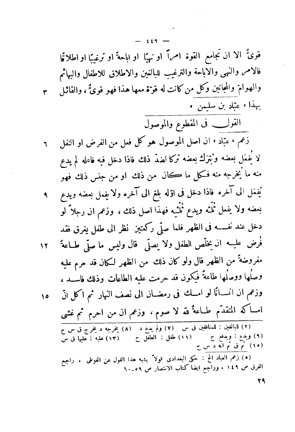 زعم عباد أن أصل الموصول هو كل فعل من الفرض أو النفل لا يفعل بعضه ويترك بعضه تركاً لضد ذلك فإذا دخل فيه فاعله لم يدع منه ما يخرجه منه فكل ما كان من ذلك أو من جنس ذلك فهو يفعل إلى آخره فإذا دخل في أوله بلغ إلى آخره ولا يفعل بعضه ويدع بعضه ولا يفعل ثلثه ويدع ثلثيه فهذا أصل ذلك، وزعم أن رجلاً لو دخل عند نفسه في الظهر فلما صلى ركعتين نظر إلى طفل يغرق فقد فرض عليه أن يخلص الطفل ولا يصلي قال: وليس ما صلى طاعة وصلها ووصلها طاعة فيكون قد حرمت عليه الطاعات وذلك فاسد، وزعم أن إنساناً لو أمسك في رمضان إلى نصف النهار ثم أكل أن إمساكه المتقدم طاعة لله لا صوم، وزعم أن من أحرم ثم غشي