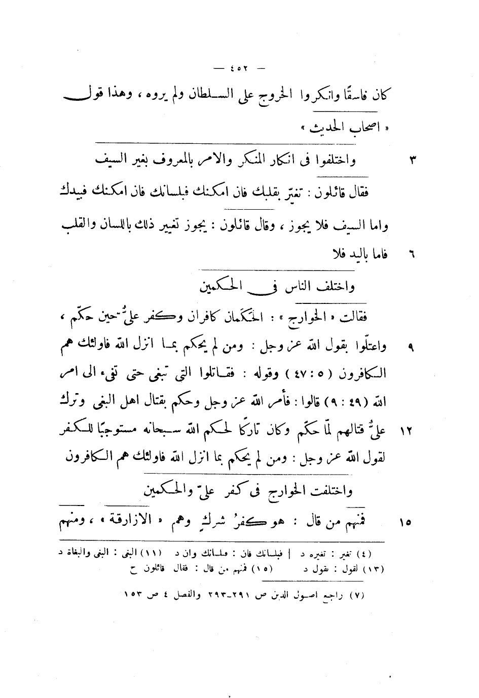 فقالت الخوارج: الحكمان كافران وكفر علي حين حكم، واعتلوا بقول الله عز وجل: ومن لم يحكم بما أنزل الله فأولئك هم الكافرون وقوله: فقاتلوا التي تبغي حتى تفيء إلى أمر الله قالوا: فأمر الله عز وجل وحكم بقتال أهل البغي وترك علي قتالهم لما حكم وكان تاركاً لحكم الله سبحانه مستوجباً للكفر لقول الله عز وجل: ومن لم يحكم بما أنزل الله فأولئك هم الكافرون.