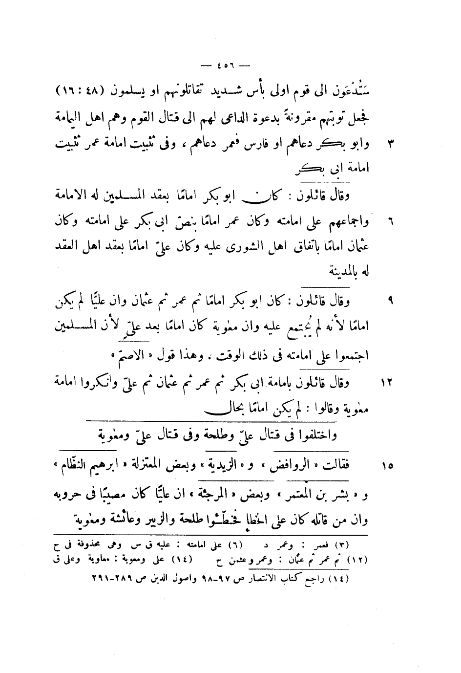وقال قائلون بإمامة أبي بكر ثم عمر ثم عثمان ثم علي وأنكروا إمامة معاوية وقالوا: لم يكن إماماً بحال.