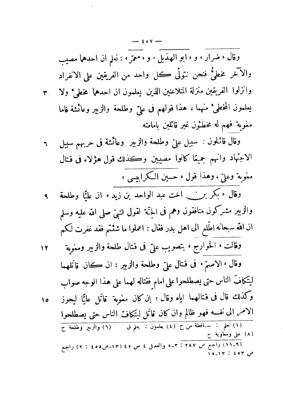 يعلمون أن أحدهما مخطئ ولا يعلمون المخطئ منهما، هذا قولهم في علي وطلحة والزبير وعائشة فأما معاوية فهم له مخطئون غير قائلين بإمامته.