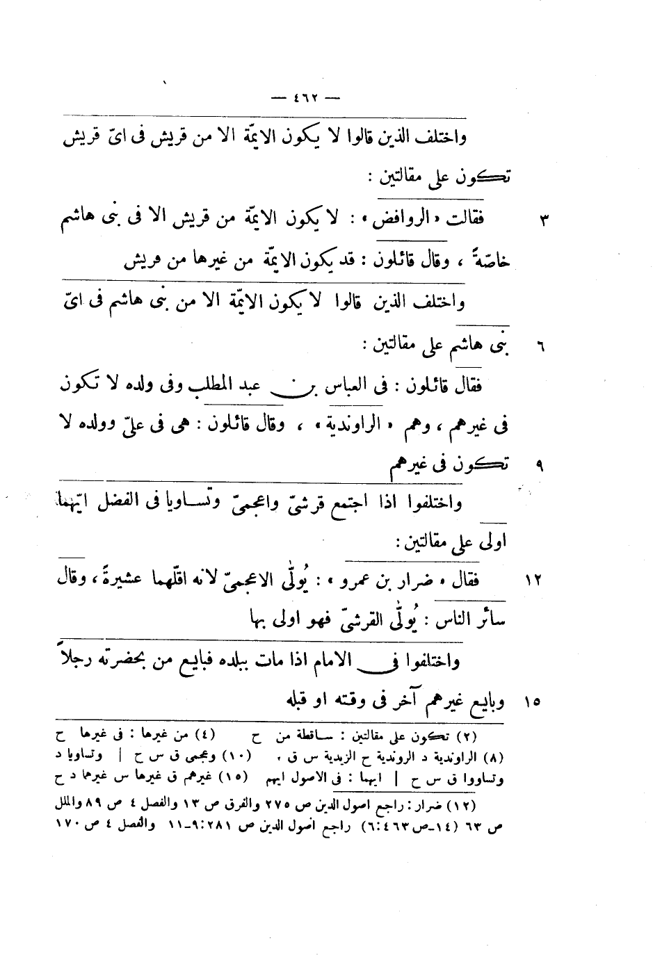فقالت الروافض: لا يكون الأيمة من قريش إلا في بني هاشم خاصة، وقال قائلون: قد يكون الأيمة من غيرها من قريش.