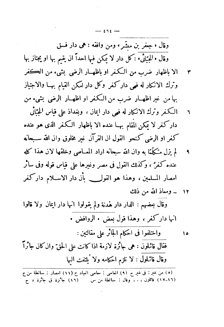 وقال الجبائي: كل دار لا يمكن فيها أحداً أن يقيم بها أو يجتاز بها إلا بإظهار ضرب من الكفر أو بإظهار الرضى بشيء من الكفر وترك الإنكار له فهي دار كفر وكل دار أمكن القيام بها والاجتياز بها من غير إظهار ضرب من الكفر أو إظهار الرضى بشيء من الكفر وترك الإنكار له فهي دار إيمان، وبغداذ على قياس الجبائي دار كفر لا يمكن المقام بها عنده إلا بإظهار الكفر الذي هو عنده كفر أو الرضى كنحو القول أن القرآن غير مخلوق وأن الله سبحانه لم يزل متكلماً به وأن الله سبحانه أراد المعاصي وخلقها لأن هذا كله عنده كفر، وكذلك القول في مصر وغيرها على قياس قوله وفي سائر أمصار المسلمين، وهذا هو القول بأن دار الإسلام دار كفر ومعاذ الله من ذلك.
