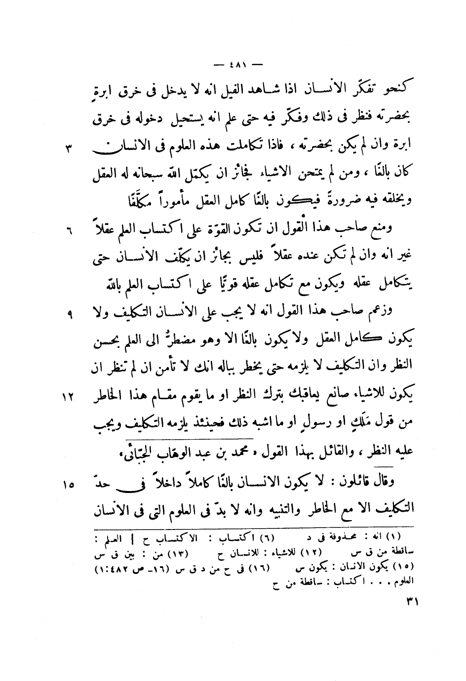 يكون للأشياء صانع يعاقبك بترك النظر أو ما يقوم مقام هذا الخاطر من قول ملك أو رسول أو ما أشبه ذلك فحينئذ يلزمه التكليف ويجب عليه النظر، والقائل بهذا القول محمد بن عبد الوهاب الجبائي.