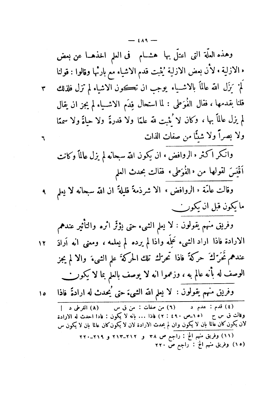 وفريق منهم يقولون: لا يعلم الشيء حتى يؤثر أثره والتأثير عندهم الإرادة فإذا أراد الشيء علمه وإذا لم يرده لم يعلمه، ومعنى أنه أراد عندهم تحرك حركة فإذا تحرك تلك الحركة علم الشيء وإلا لم يجز الوصف له بأنه عالم به، وزعموا أنه لا يوصف بالعلم بما لا يكون.