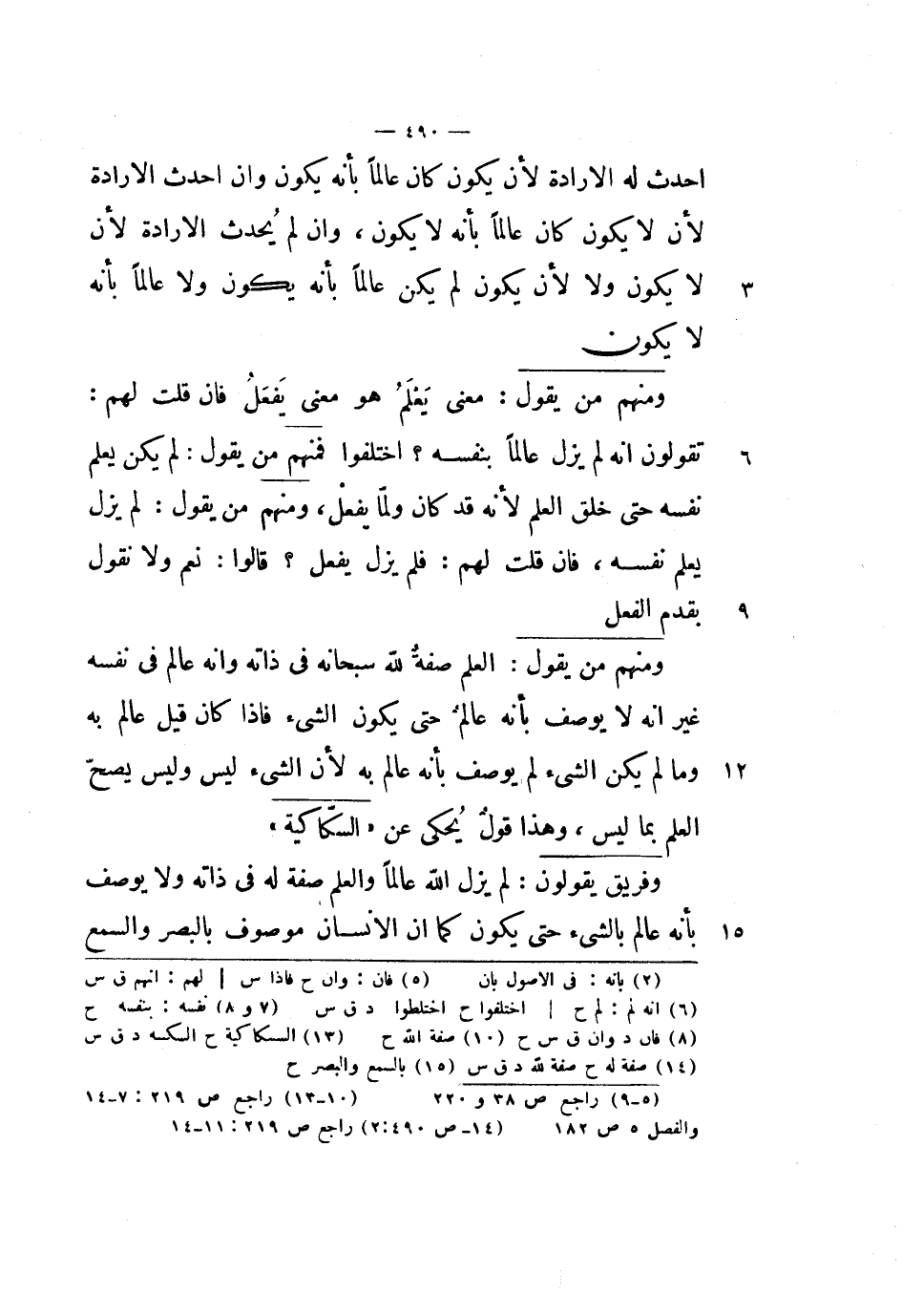 ومنهم من يقول: العلم صفة لله سبحانه في ذاته وأنه عالم في نفسه غير أنه لا يوصف بأنه عالم حتى يكون الشيء فإذا كان قيل عالم به وما لم يكن الشيء لم يوصف بأنه عالم به لأن الشيء ليس وليس يصح العلم بما ليس، وهذا قول يحكى عن السكاكية.