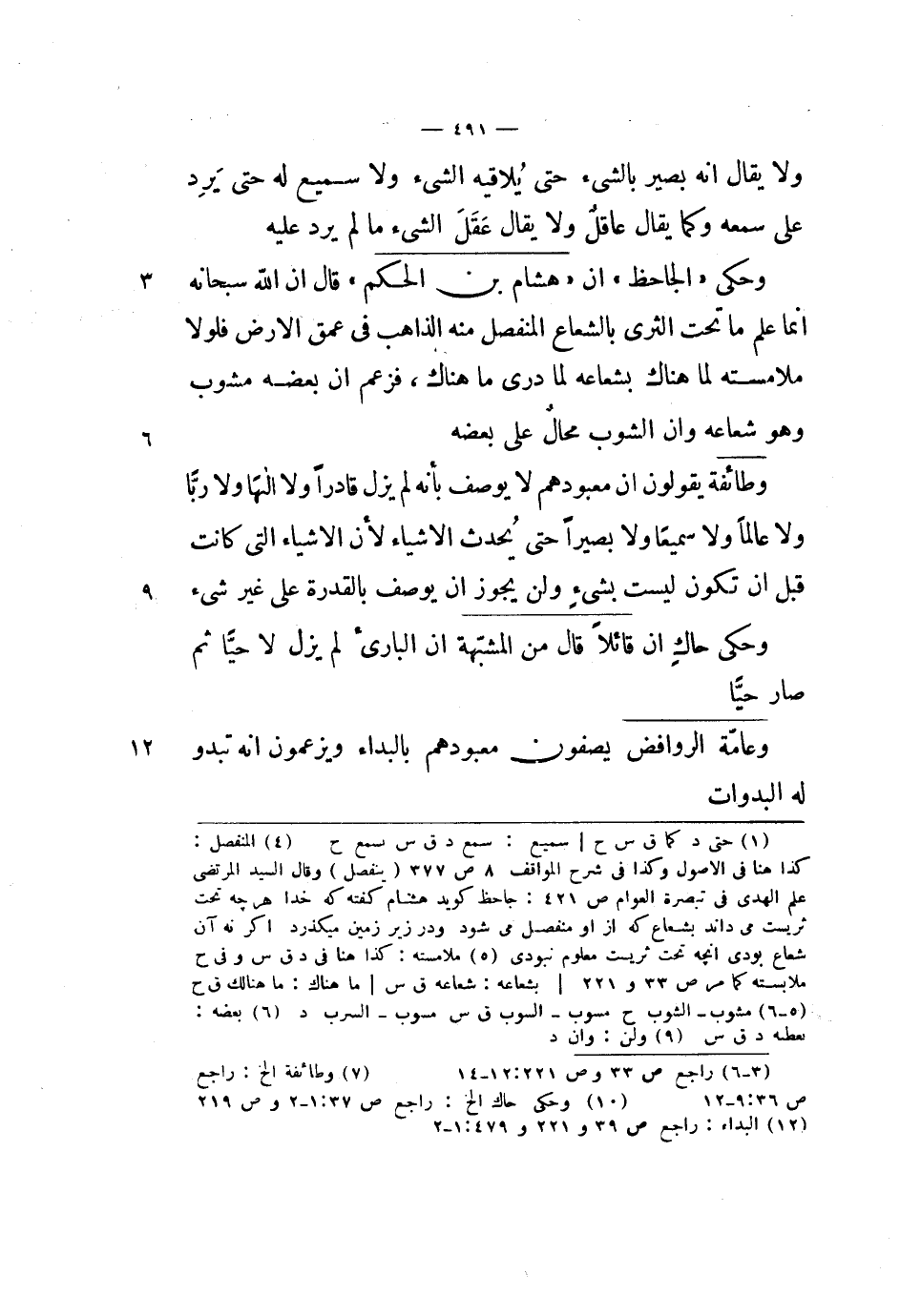 وحكى الجاحظ أن هشام بن الحكم قال أن الله سبحانه إنما علم ما تحت الثرى بالشعاع المنفصل منه الذاهب في عمق الأرض فلولا ملامسته لما هناك بشعاعه لما درى ما هناك، فزعم أن بعضه مشوب وهو شعاعه وأن الشوب محال على بعضه.
