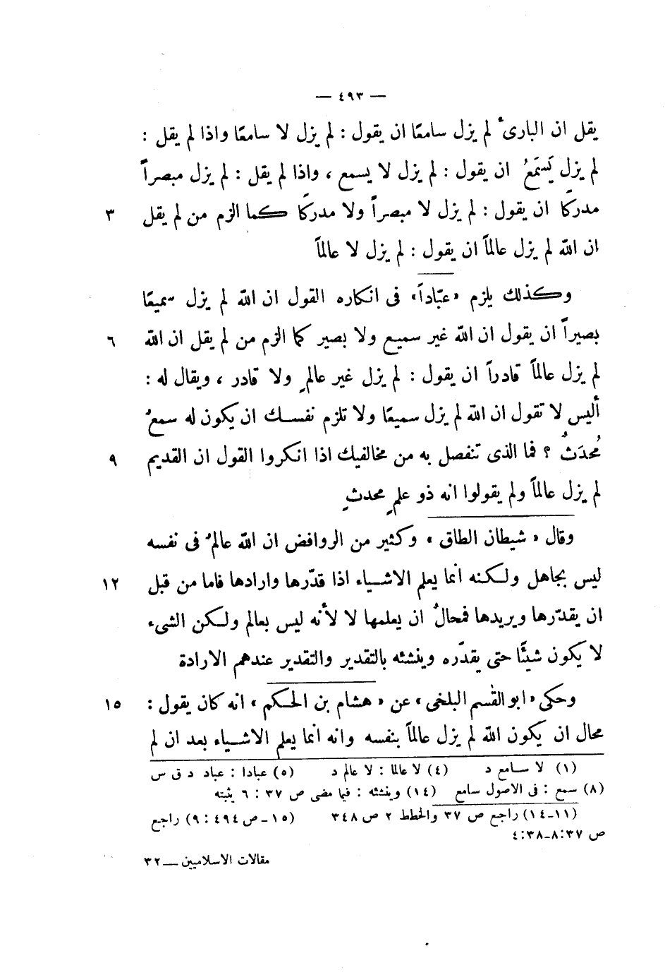 وكذلك يلزم عباداً في إنكاره القول أن الله لم يزل سميعاً بصيراً أن يقول أن الله غير سميع ولا بصير كما ألزم من لم يقل أن الله لم يزل عالماً قادراً أن يقول: لم يزل غير عالم ولا قادر، ويقال له: أليس لا تقول أن الله لم يزل سميعاً ولا تلزم نفسك أن يكون له سمع محدث؟ فما الذي تنفصل به من مخالفيك إذا أنكروا القول أن القديم لم يزل عالماً ولم يقولوا أنه ذو علم محدث.