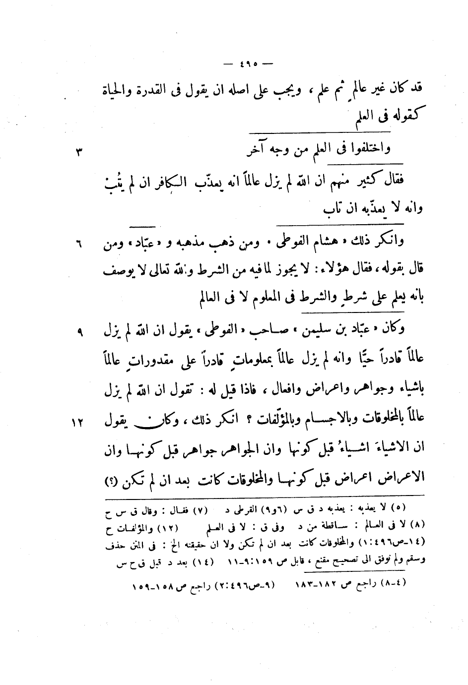 وكان عباد بن سليمان صاحب الفوطي يقول أن الله لم يزل عالماً قادراً حياً وأنه لم يزل عالماً بمعلومات قادراً على مقدورات عالماً بأشياء وجواهر وأعراض وأفعال، فإذا قيل له: تقول أن الله لم يزل عالماً بالمخلوقات وبالأجسام وبالمؤلفات؟ أنكر ذلك، وكلن يقول أن الأشياء أشياء قبل كونها وأن الجواهر جواهر قبل كونها وأن الأعراض أعراض قبل كونها والمخلوقات كانت بعد أن لم تكن