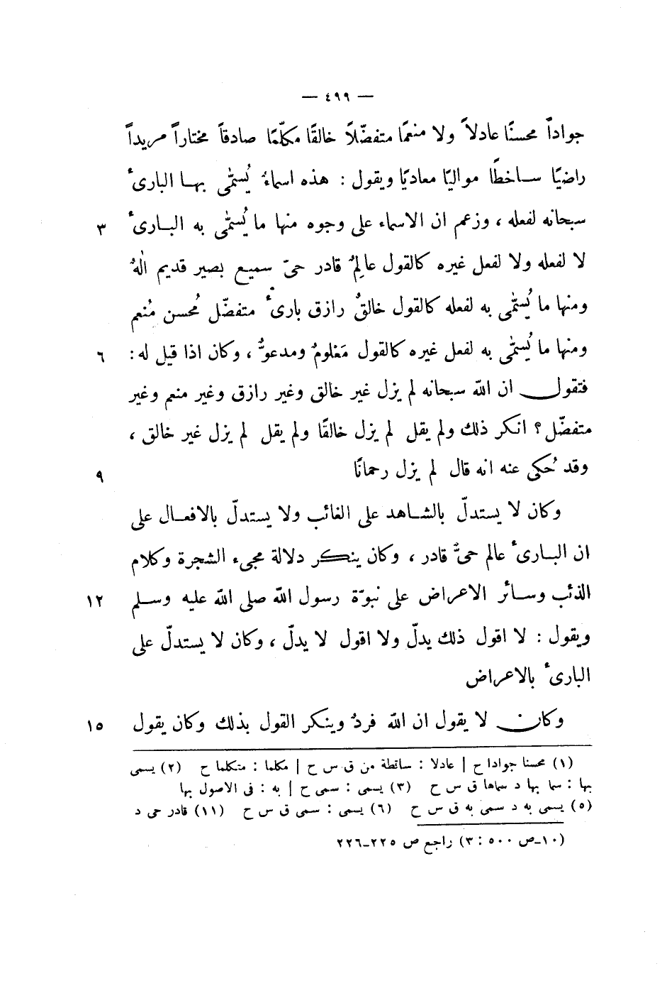 متفضلاً خالقاً مكلماً صادقاً مختاراً مريداً راضياً ساخطاً موالياً معادياً ويقول: هذه أسماء يسمى بها البارئ سبحانه لفعله، وزعم أن الأسماء على وجوه منها ما يسمى به البارئ لا لفعله ولا لفعل غيره كالقول عالم قادر حي سميع بصير قديم إله ومنها ما يسمى به لفعله كالقول خالق رازق بارئ متفضل محسن منعم ومنها ما يسمى به لفعل غيره كالقول معلوم ومدعو، وكان إذا قيل له: فتقول أن الله سبحانه لم يزل غير خالق وغير رازق وغير منعم وغير متفضل؟ أنكر ذلك ولم يقل لم يزل خالقاً ولم يقل لم يزل غير خالق، وقد حكي عنه أنه قال: لم يزل رحماناً.