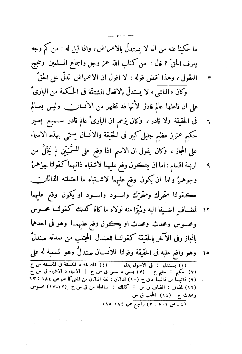 ما حكينا عنه من أنه لا يستدل بالأعراض، وإذا قيل له: من كم وجه يعرف الحق؟ قال: من كتاب الله عز وجل وإجماع المسلمين وحجج العقول، وهذا نقض قوله: لا أقول أن الأعراض تدل على الحق.
