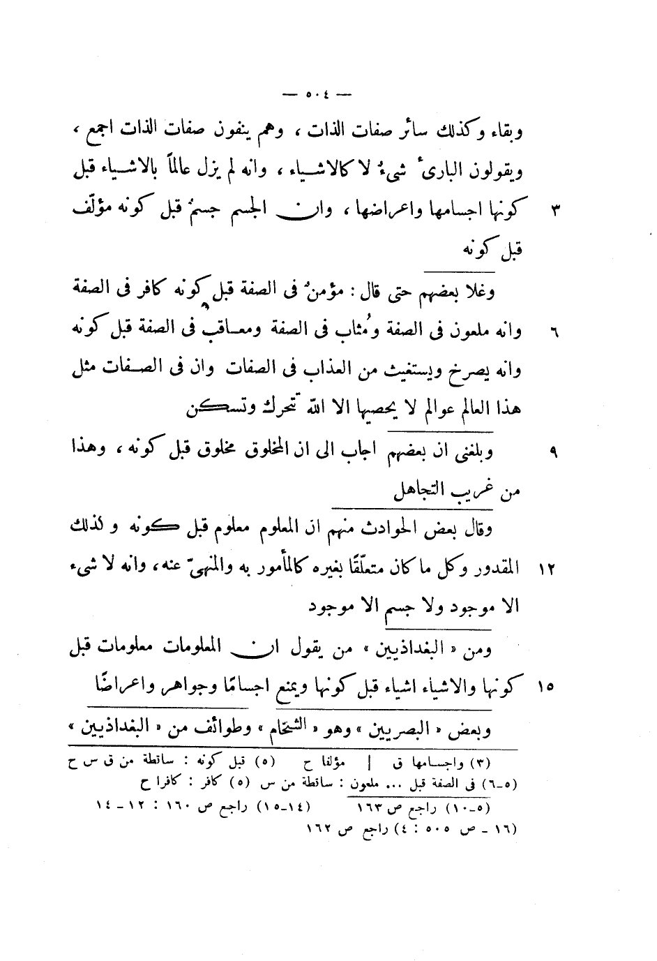 وقال بعض الحوادث منهم أن المعلوم معلوم قبل كونه وكذلك المقدور وكل ما كان متعلقاً بغيره كالمأمور به والمنهي عنه، وأنه لا شيء إلا موجود ولا جسم إلا موجود.