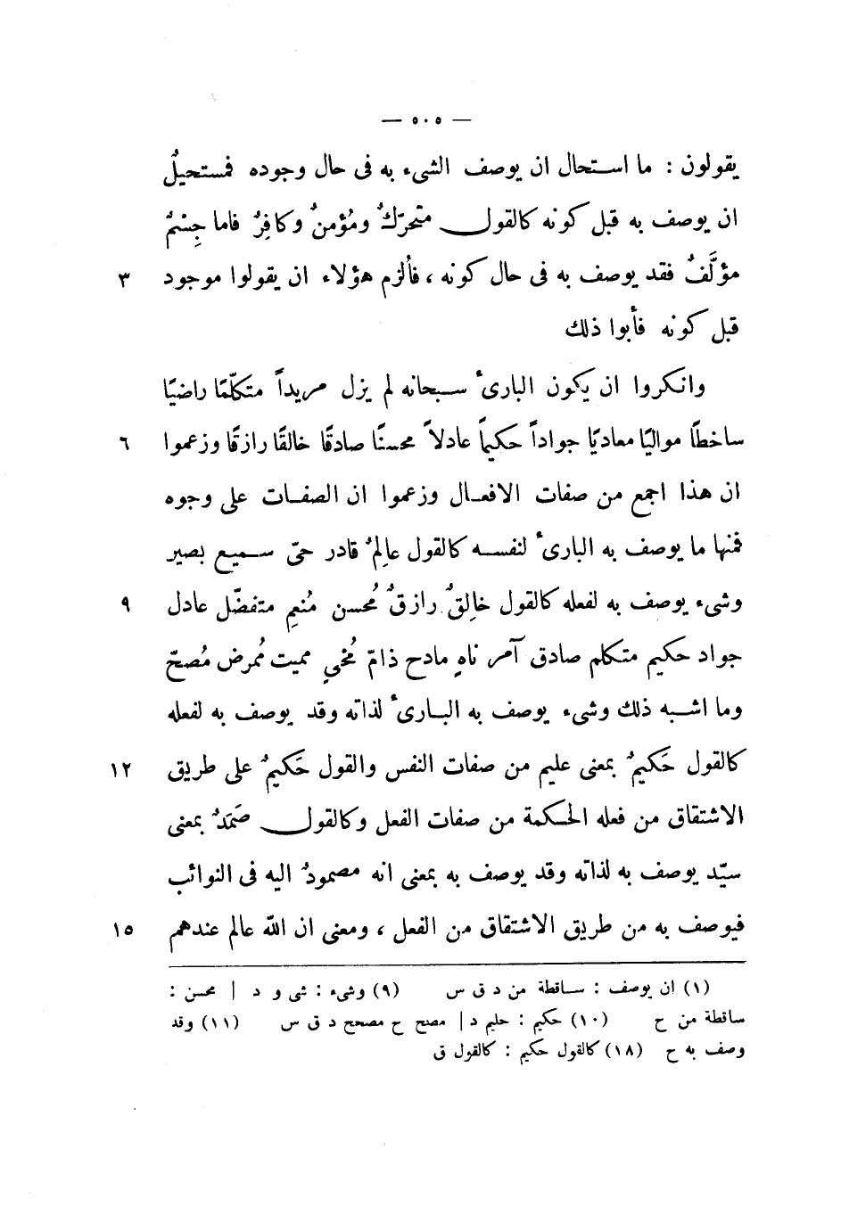 الأفعال وزعموا أن الصفات على وجوه فمنها ما يوصف به البارئ لنفسه كالقول عالم قادر حي سميع بصير وشيء يوصف به لفعله كالقول خالق رازق محسن منعم متفضل عادل جواد حكيم متكلم صادق آمر ناه مادح ذام محي مميت ممرض مصح وما أشبه ذلك وشيء يوصف به البارئ لذاته وقد يوصف به لفعله كالقول حكيم بمعنى عليم من صفات النفس والقول حكيم على طريق الاشتقاق من فعله الحكمة من صفات الفعل وكالقول صمد بمعنى سيد يوصف به لذاته وقد يوصف به بمعنى أنه مصمود إليه في النوائب فيوصف به من طريق الاشتقاق من الفعل، ومعنى أن الله عالم عندهم