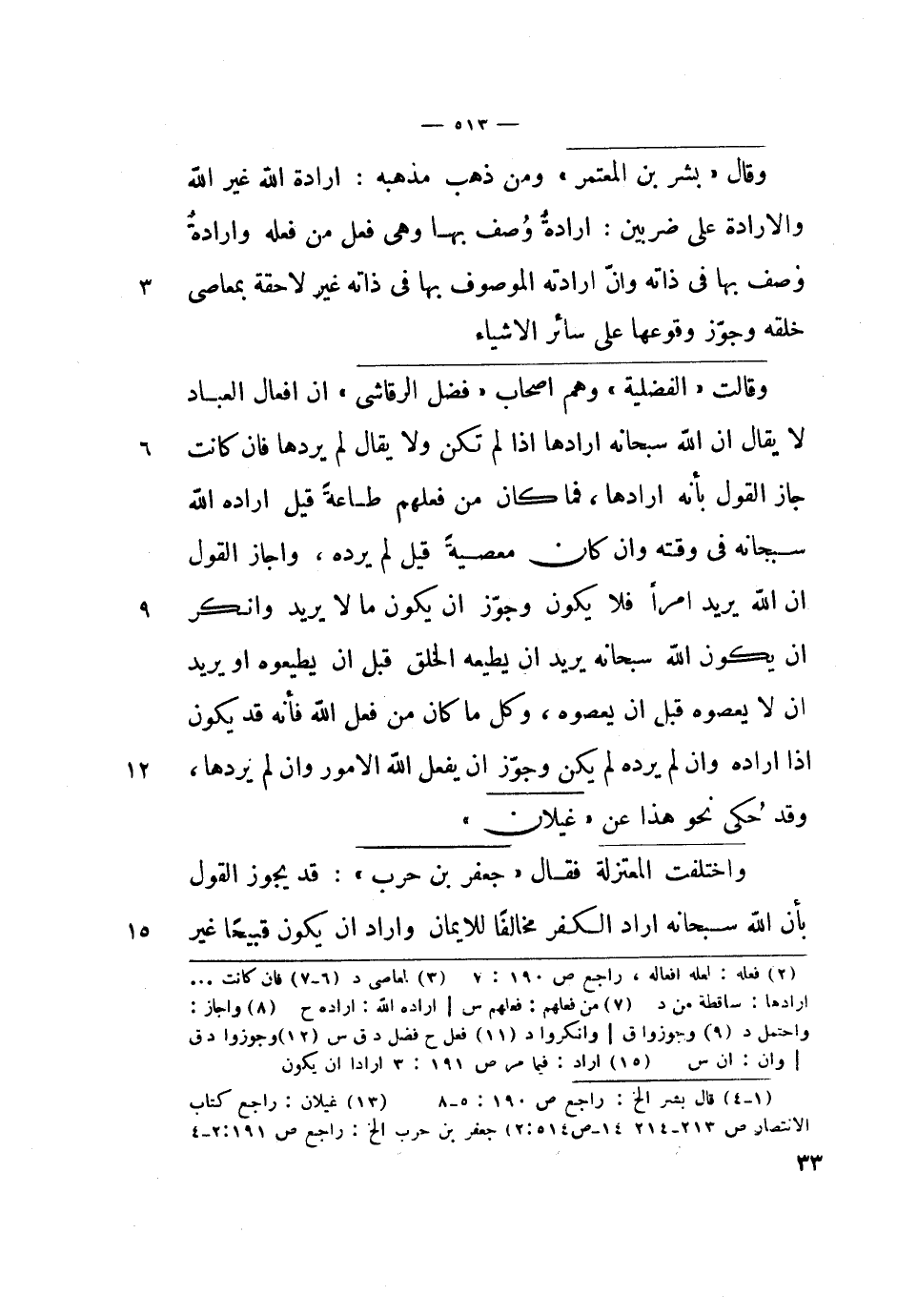 وقال بشر بن المعتمر ومن ذهب مذهبه: إرادة الله غير الله والإرادة على ضربين: إرادة وصف بها وهي فعل من فعله وإرادة وصف بها في ذاته وأن إرادته الموصوف بها في ذاته غير لاحقة بمعاصي خلقه وجوز وقوعها على سائر الأشياء.