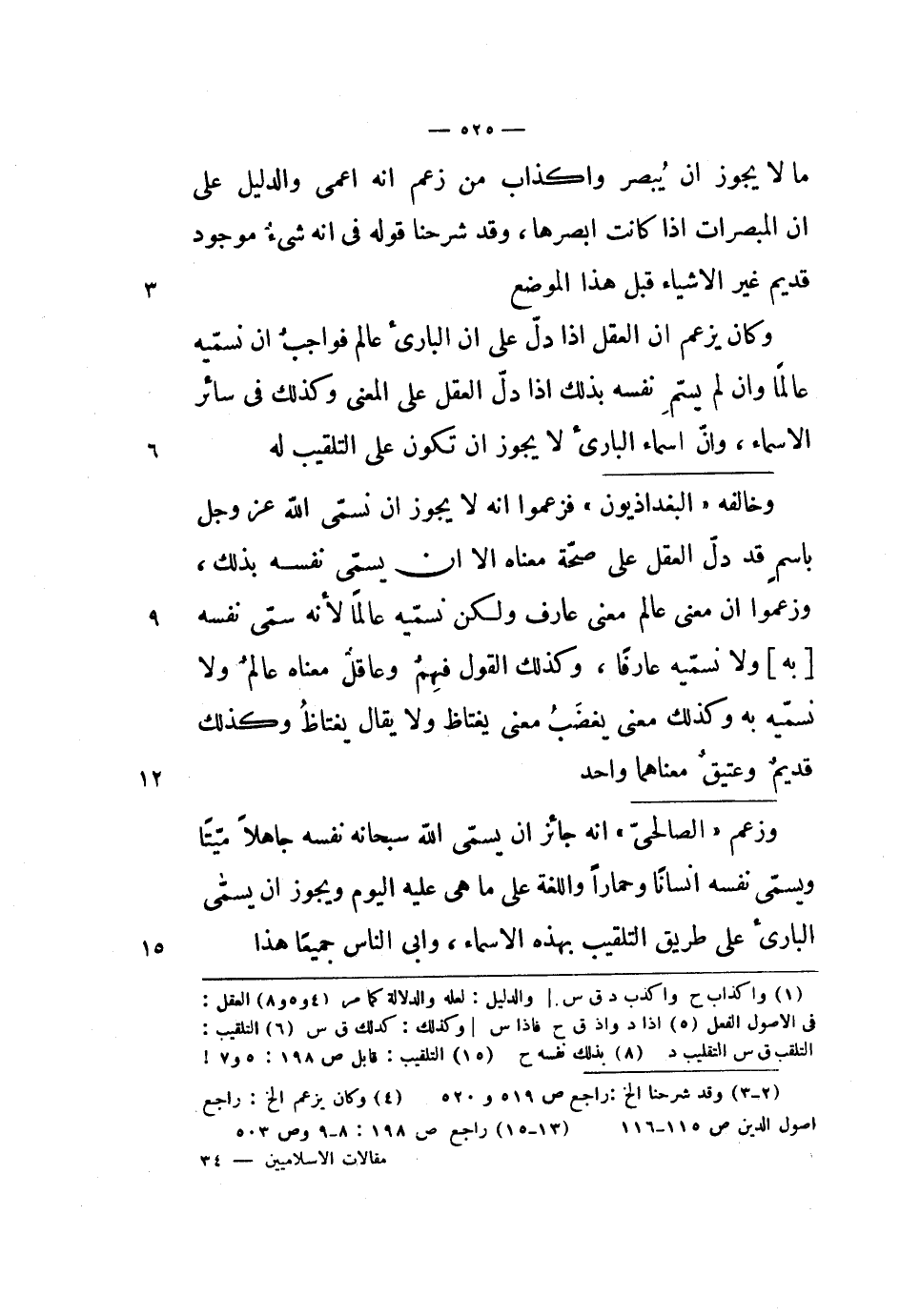 وكان يزعم أن العقل إذا دل على أن البارئ عالم فواجب أن نسميه عالماً وإن لم يسم نفسه بذلك إذا دل العقل على المعنى وكذلك في سائر الأسماء، وأن أسماء البارئ لا يجوز أن تكون على التقليب له.