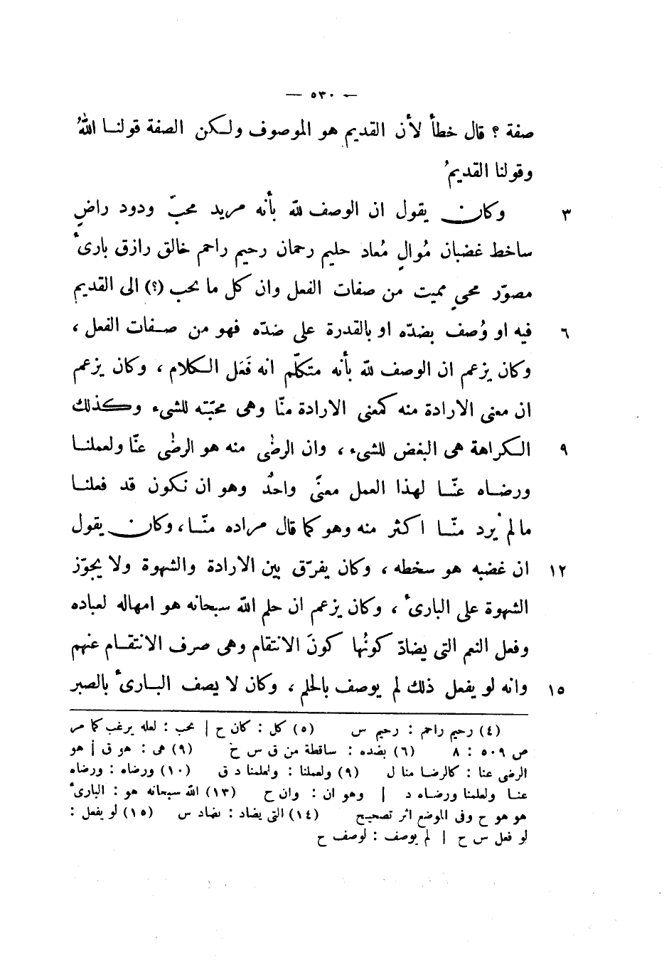 منا، وكان يقول أن غضبه هو سخطه، وكان يفرق بين الإرادة والشهوة ولا يجوز الشهوة على البارئ، وكان يزعم أن حلم الله سبحانه هو إمهاله لعباده وفعل النعم التي يضاد كونها كون الانتقام وهي صرف الانتقام عنهم وأنه لو يفعل ذلك لم يوصف بالحلم، وكان لا يصف البارئ بالصبر