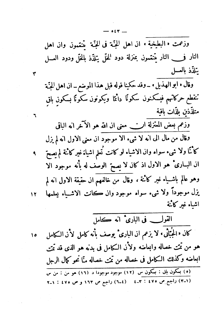 كان الجبائي لا يزعم أن البارئ يوصف بأنه كامل لأن الكامل هو من تمت خصاله وأبعاضه ولأن الكامل في بدنه هو الذي قد تمت أبعاضه وكذلك الكامل في خصاله من تمت خصاله منا نحو كمال الرجل