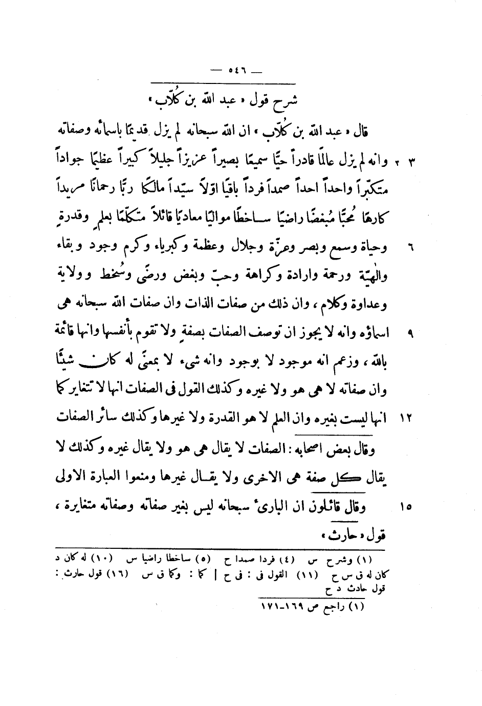 قال عبد الله بن كلاب أن الله سبحانه لم يزل قديماً بأسمائه وصفاته وأنه لم يزل عالماً قادراً حياً سميعاً بصيراً عزيزاً جليلاً كبيراً عظيماً جواداً متكبراً واحداً صمداً فرداً باقياً أولاً سيداً مالكاً رباً رحماناً مريداً كارهاً محباً مبغضاً راضياً ساخطاً موالياً معادياً قائلاً متكلماً بعلم وقدرة وحياة وسمع وبصر وعزة وجلال وعظمة وكبرياء وكرم وجود وبقاء وإلهية ورحمة وإرادة وكراهة وحب وبغض