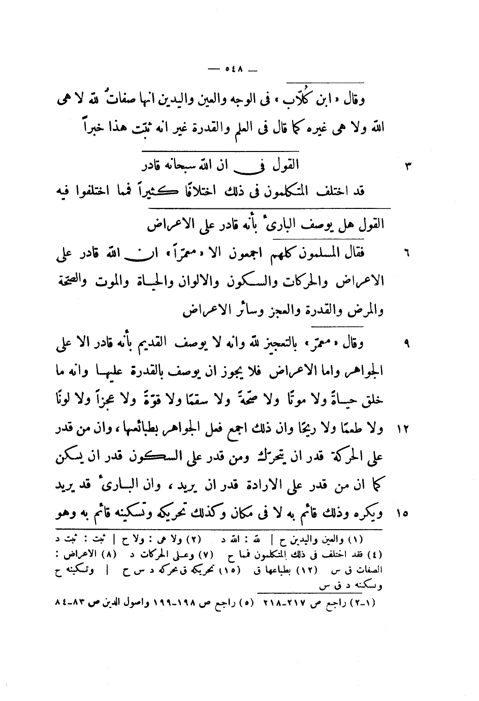 فقال المسلمون كلهم أجمعون إلا معمراً أن الله قادر على الأعراض والحركات والسكون والألوان والحياة والموت والصحة والمرض والقدرة والعجز وسائر الأعراض.