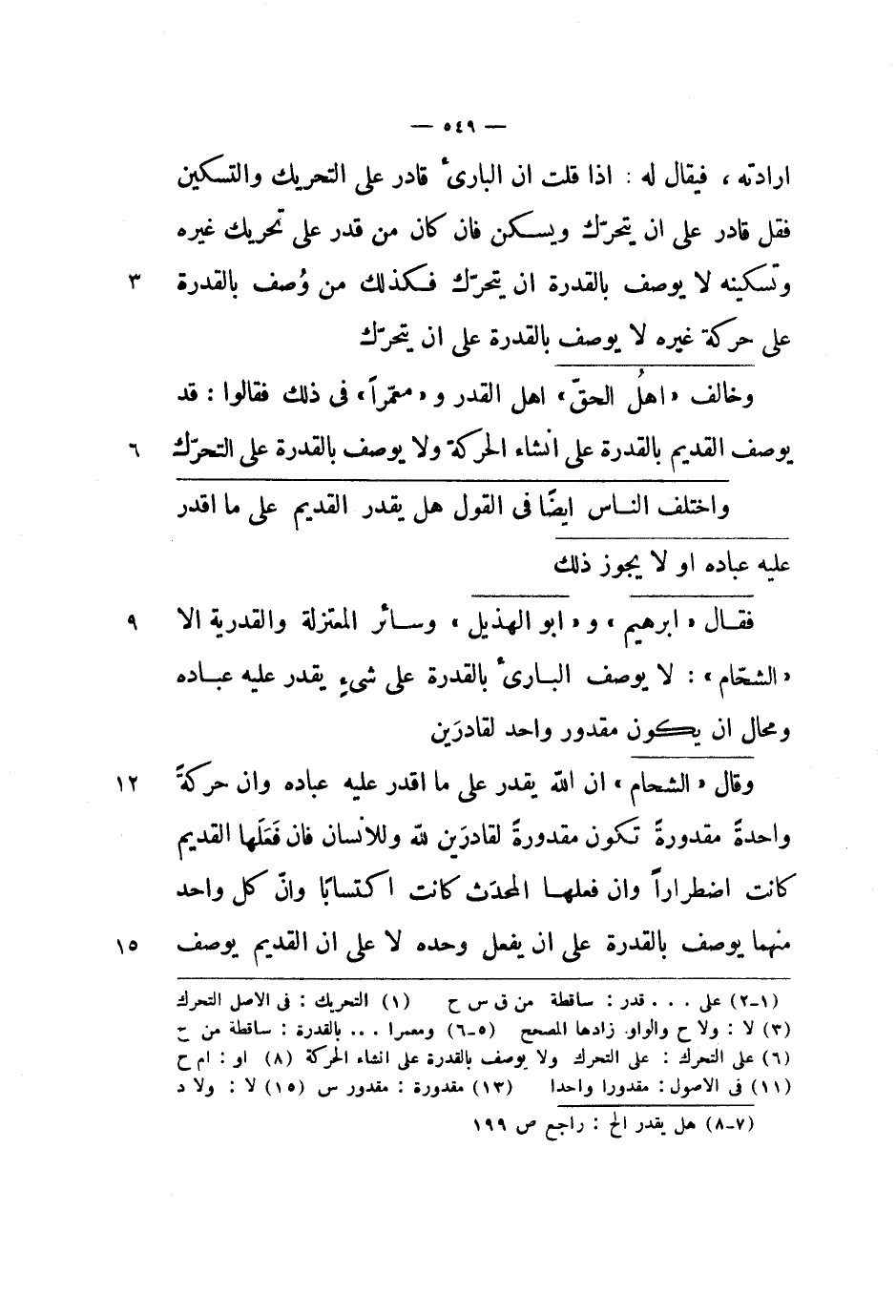 إرادته، فيقال له: إذا قلت أن البارئ قادر على التحريك والتسكين فقل قادر على أن يتحرك ويسكن فإن كان من قدر على تحريك غيره وتسكينه لا يوصف بالقدرة أن يتحرك فكذلك من وصف بالقدرة على حركة غيره لا يوصف بالقدرة على أن يتحرك.