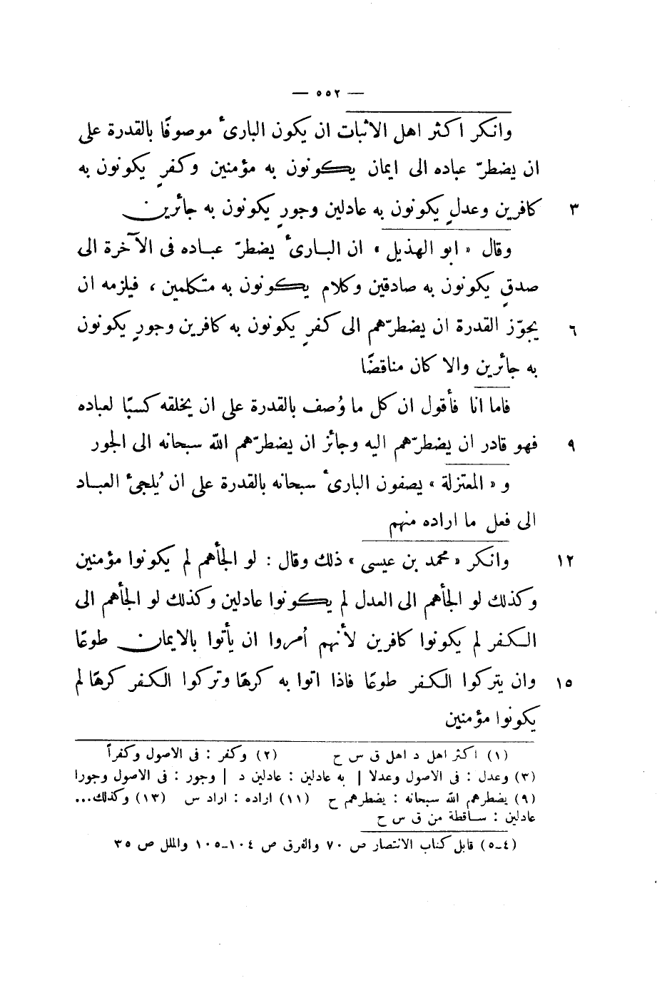 وأنكر أكثر أهل الإثبات أن يكون البارئ موصوفاً بالقدرة على أن يضطر عباده إلى إيمان يكونون به مؤمنين وكفر يكونون به كافرين وعدل يكونون به عادلين وجور يكونون به جائرين.