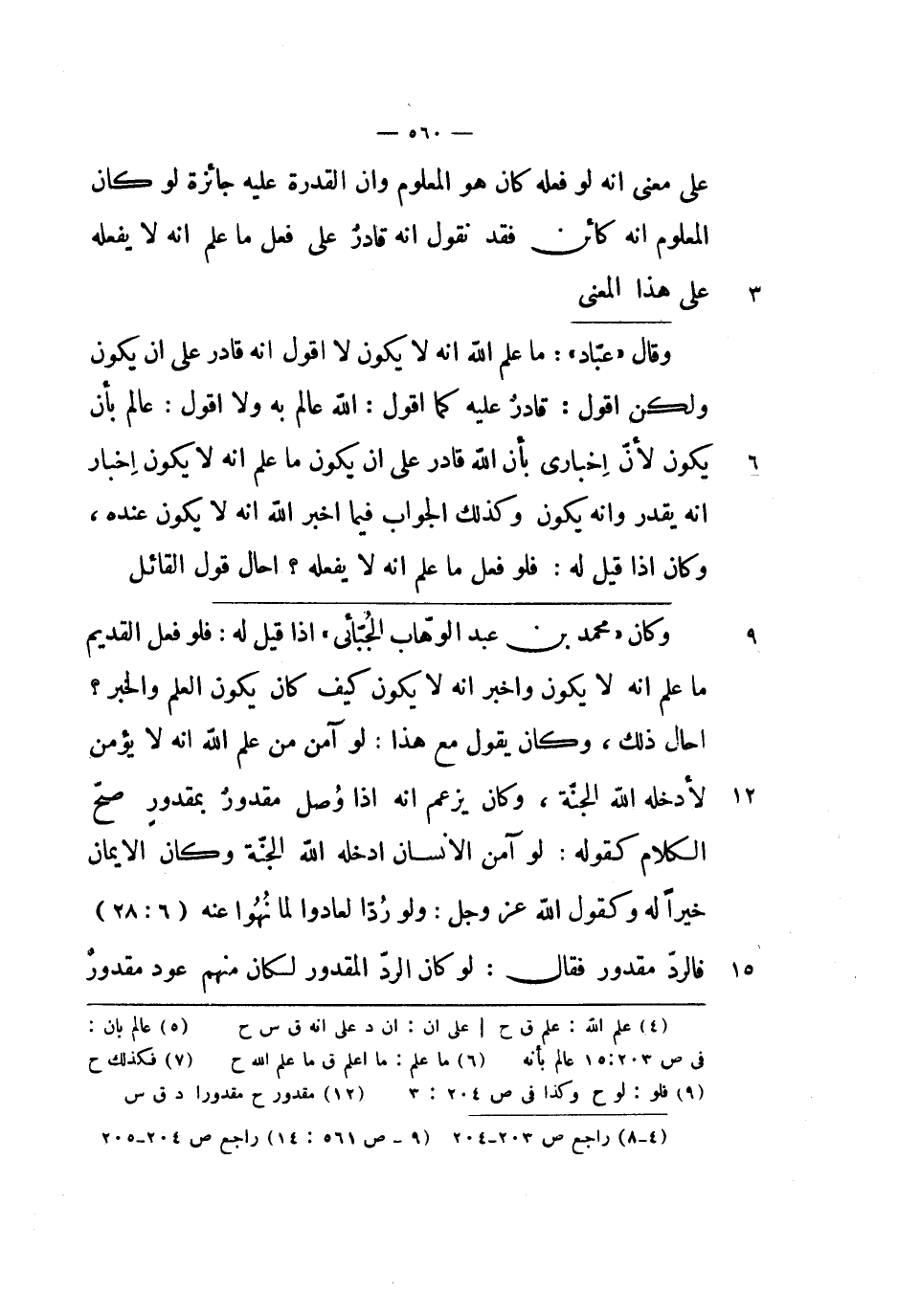 وقال عباد: ما علم الله أنه لا يكون لا أقول أنه قادر على أن يكون ولكن أقول: قادر عليه كما أقول: الله عالم به ولا أقول: عالم بأن يكون لأن إخباري بأن الله قادر على أن يكون ما علم أنه لا يكون إخبار أنه يقدر وأنه يكون وكذلك الجواب فيما أخبر الله أنه لا يكون عنده، وكان إذا قيل له: فلو فعل ما علم أنه لا يفعله؟ أحال قول القائل.