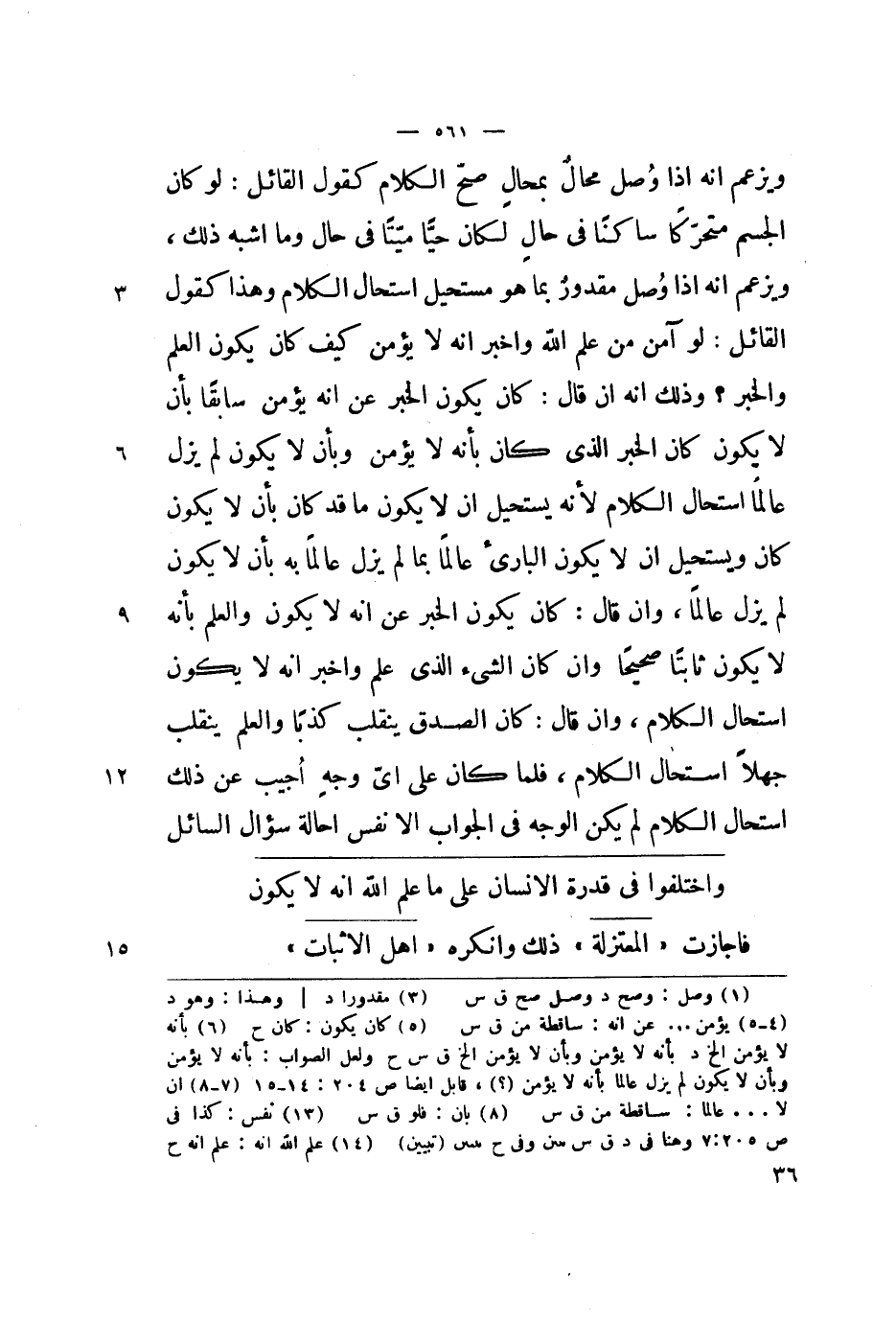 الكلام كقول القائل: لو كان الجسم متحركاً ساكناً في حال لكان حياً ميتاً في حال وما أشبه ذلك، ويزعم أنه إذا وصل مقدور بما هو مستحيل استحال الكلام وهذا كقول القائل: لو آمن من علم الله وأخبر أنه لا يؤمن كيف كان يكون العلم والخبر؟ وذلك أنه إن قال: كان يكون الخبر عن أنه يؤمن سابقاً بأن لا يكون كان الخبر الذي كان بأنه لا يؤمن وبأن لا يكون لم يزل عالماً استحال الكلام لأنه يستحيل أن لا يكون ما قد كان بأن لا يكون كان ويستحيل أن لا يكون البارئ عالماً بما لم يزل عالماً به بأن لا يكون لم يزل عالماً، وإن قال: كان يكون الخبر عن أنه لا يكون والعلم بأنه لا يكون ثابتاً صحيحاً وإن كان الشيء الذي علم وأخبر أنه لا يكون استحال الكلام، فلما كان على أي وجه أجيب عن ذلك استحال الكلام لم يكن الوجه في الجواب إلا نفس إحالة سؤال السائل.