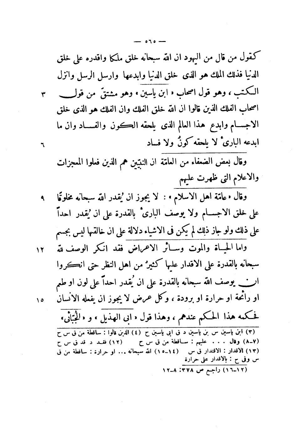 وقال عامة أهل الإسلام: لا يجوز أن يقدر الله سبحانه مخلوقاً على خلق الأجسام ولا يوصف البارئ بالقدرة على أن يقدر أحداً على ذلك ولو جاز ذلك لم يكن في الأشياء دلالة على أن خالقها ليس بجسم وأما الحياة والموت وسائر الأعراض فقد أنكر الوصف لله سبحانه بالقدرة على الإقدار عليها كثير من أهل النظر حتى أنكروا أن يوصف الله سبحانه بالقدرة على أن يقدر أحداً على لون أو طعم أو رائحة أو حرارة أو برودة، وكل عرض لا يجوز أن يفعله الإنسان فحكمه هذا الحكم عندهم، وهذا قول أبي الهذيل والجبائي.
