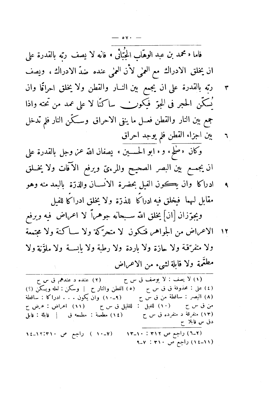 فأما محمد بن عبد الوهاب الجبائي فإنه لا يصف ربه بالقدرة على أن يخلق الإدراك مع العمى لأن العمى عنده ضد الإدراك، ويصف ربه بالقدرة على أن يجمع بين النار والقطن ولا يخلق إحراقاً وأن يسكن الحجر في الجو فيكون ساكناً لا على عمد من تحته وإذا جمع بين النار والقطن فعل ما ينفي الإحراق وسكن النار فلم تدخل بين أجزاء القطن فلم يوجد إحراق.