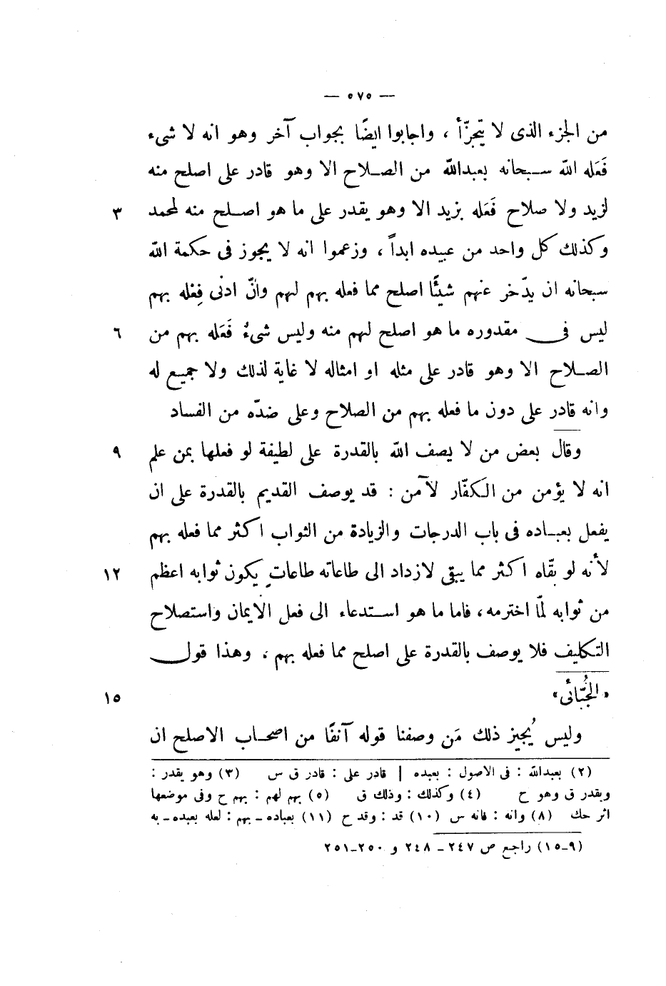 من الجزء الذي لا يتجزأ، وأجابوا أيضاً بجواب آخر وهو أنه لا شيء فعله الله سبحانه بعبد الله من الصلاح إلا وهو قادر على أصلح منه لزيد ولا صلاح فعله بزيد إلا وهو يقدر على ما هو أصلح منه لمحمد وكذلك كل واحد من عبيده أبداً، وزعموا أنه لا يجوز في حكمة الله سبحانه أن يدخر عنهم شيئاً أصلح مما فعله بهم لهم وأن أدنى فعله بهم ليس في مقدوره ما هو أصلح لهم منه وليس شيء فعله بهم من الصلاح إلا وهو قادر على مثله أو أمثاله لا غاية لذلك ولا جميع له وأنه قادر على دون ما فعله بهم من الصلاح وعلى ضده من الفساد.