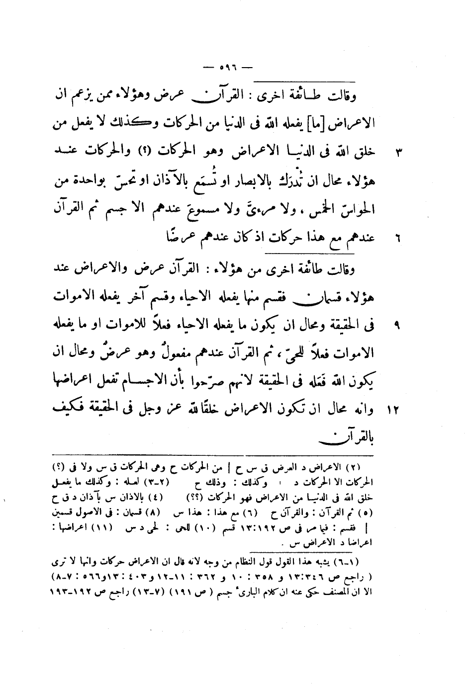 وقالت طائفة أخرى من هؤلاء: القرآن عرض والأعراض عند هؤلاء قسمان فقسم منها يفعله الأحياء وقسم آخر يفعله الأموات في الحقيقة ومحال أن يكون ما يفعله الأحياء فعلاً للأموات أو ما يفعله الأموات فعلاً للحي، ثم القرآن عندهم مفعول وهو عرض ومحال أن يكون الله فعله في الحقيقة لأنهم صرحوا بأن الأجسام تفعل أعراضها وأنه محال أن تكون الأعراض خلقاً لله عز وجل في الحقيقة فكيف بالقرآن.