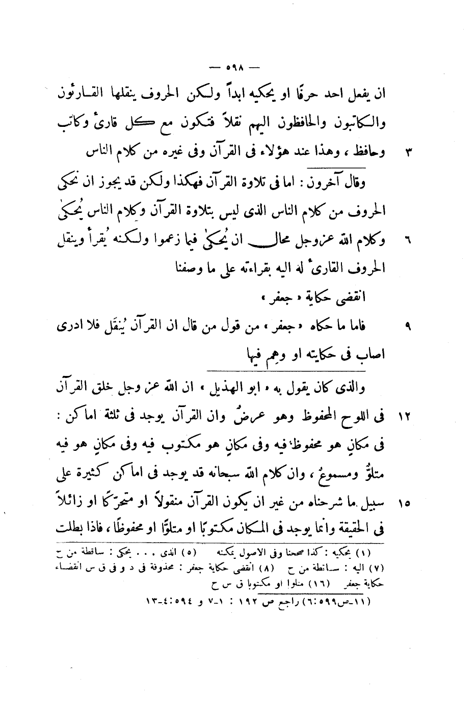 وقال آخرون: أما في تلاوة القرآن فهكذا ولكن قد يجوز أن نحكي الحروف من كلام الناس الذي ليس بتلاوة القرآن وكلام الناس يحكى وكلام الله عز وجل محال أن يحكى فيما زعموا ولكنه يقرأ وينقل الحروف القارئ له إليه بقراءته على ما وصفنا.