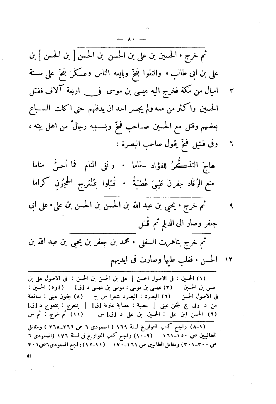 ثم خرج الحسين بن علي بن الحسن بن الحسن بن الحسن بن علي بن أبي طالب والتقوا بفخ وبايعه الناس وعسكر بفخ على ستة أميال من مكة فخرج إليه عيسى بن موسى في أربعة آلاف فقتل الحسين وأكثر من معه ولا يجسر أحد أن يدفنهم حتى أكلت السباع بعضهم وقتل مع الحسين صاحب فخ وبسببه رجال من أهل بيته، وفي قتيل فخ يقول صاحب البصرة: