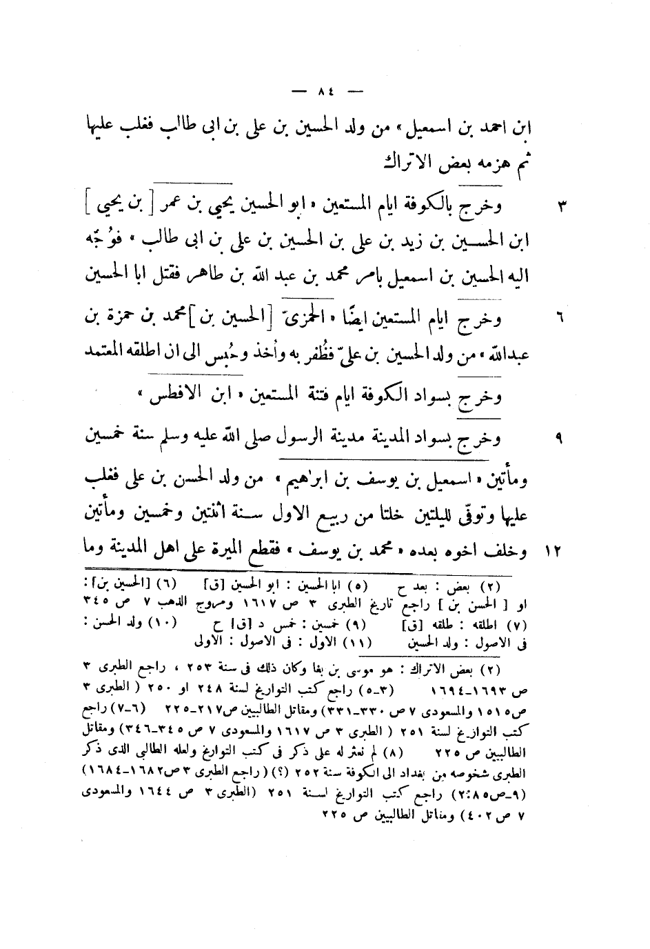وخرج بالكوفة أيام المستعين أبو الحسين يحيى بن عمر بن يحيى بن الحسين بن زيد بن علي بن الحسين بن علي بن أبي طالب فوجه إليه الحسين بن إسماعيل بأمر محمد بن عبد الله بن طاهر فقتل أبا الحسين.