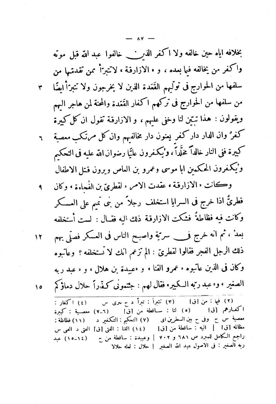 بخلافه إياه حين خالفه ولا أكفر الذين خالفوا عبد الله قبل موته وأكفر من يخالفه فيما بعده، والأزارقة لا تتبرأ ممن تقدمتها من سلفها من الخوارج في توليهم القعدة الذين لا يخرجون ولا تتبرأ أيضاً من سلفها من الخوارج في تركهم إكفار القعدة والمحنة لمن هاجر إليهم ويقولون: هذا تبين لنا وخفي عليهم، والأزارقة تقول أن كل كبيرة كفر وأن الدار دار كفر يعنون دار مخالفيهم وأن كل مرتكب معصية كبيرة ففي النار خالداً مخلداً، ويكفرون علياً رضوان الله عليه في التحكيم ويكفرون الحكمين أبا موسى وعمرو بن العاص ويرون قتل الأطفال.